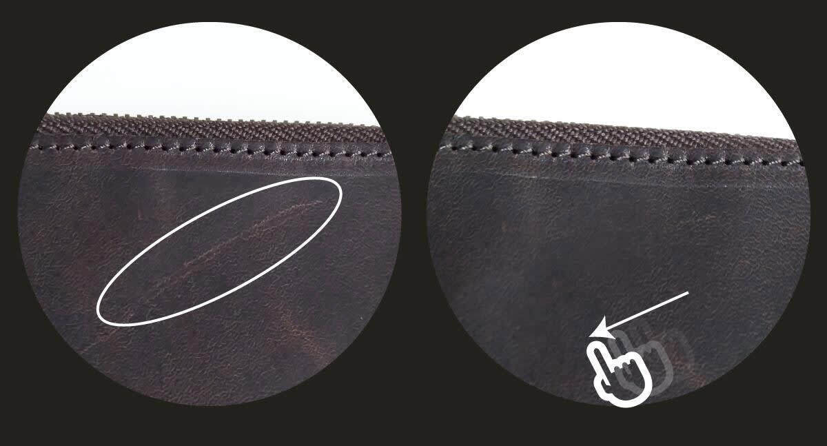 革は爪傷などで傷つきやすいのですが、馬革は指先で擦るとオイルが溶け出し傷も目立たなくなります。