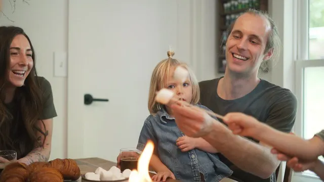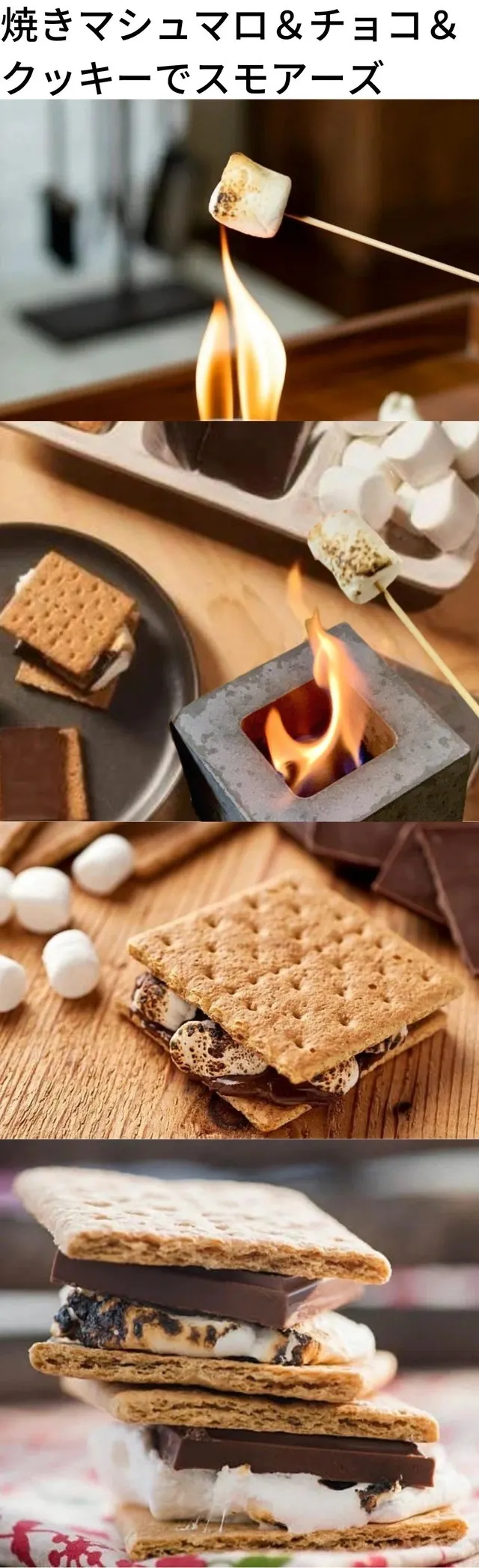 焼きマシュマロをチョコレートと一緒にビスケットにはさめば、あなただけのスモアーズが完成!