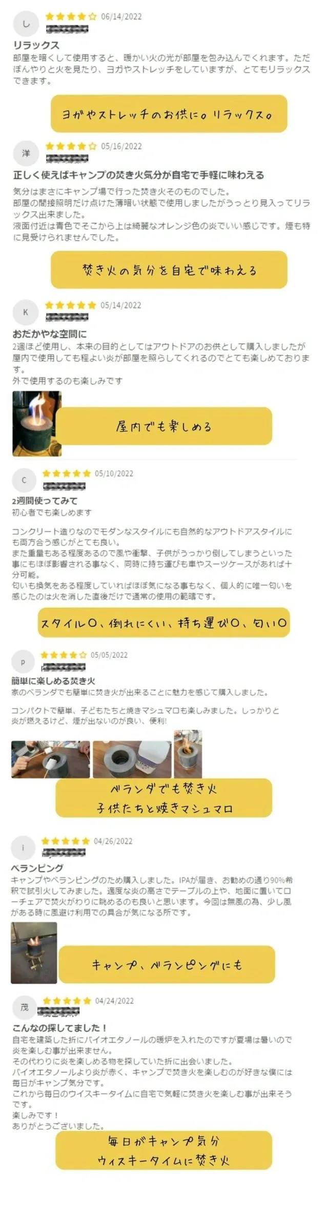 2023/07/17 11:077/13に税関検査が合格し、配車手続きも済み、倉庫到着日が7/19(水)となりました。当初の予定より数週間遅くなりましたが、到着時間次第では7/19(水)の当日発送開始、おおよそ 7/20,7/21 には発送完了となる見込みです。発送ラベルは完成しているため、到着次第、1個1個に解体し、貼り付けて発送となります。皆さまにはお待ちいただきありがとうございます。IPA燃料をどれがおすすめかと何名かに聞かれましたので、以下、説明書より抜粋してお知らせいたします。-------------以下説明書より一部抜粋IPA燃料のおすすめ例:アマゾン:IPA99.9% を90%に薄めてお使いいただけます。1本 https://amzn.to/3USEDBR2本 https://amzn.to/3AaGRmC4本 https://amzn.to/41KHZJ8(その他大容量のものでもIPA99.9%でしたら使えます)…まずは試しに火をつけてみましょう。先に消火用のコースターやフタ、ベースをご用意下さいベースの上に本体を置き、しっかりとはめこみます。99.9%のIPA燃料をフリッカーファイヤーに注ぎ、約1/10の水(目分量OK)を注いで90%のIPAにして点火してみてください。※初めは上記のように、90%の濃さが使いやすいです※室内で100%IPAを燃やすと炎が大きすぎるのでおやめください本物の炎がでますので1.換気を1時間ごとに行う。2.上から2㎝以上までギリギリに燃料を入れない。3.燃えるものを1m以内に置かない。4.炎を放置してどこかへ行かない。5.平らなところに置く。6.点火中に燃料を継ぎ足さない。7.消火後しばらくは熱いので触らない。8.口で吹いて消そうとしない。9.幼児や泥酔者に触れさせない。をお願いいたします。ご質問のある方はメッセージフォーム、インスタ、ラインのいずれかよりメッセージを下さい。よろしくお願いいたします。 もっと見る