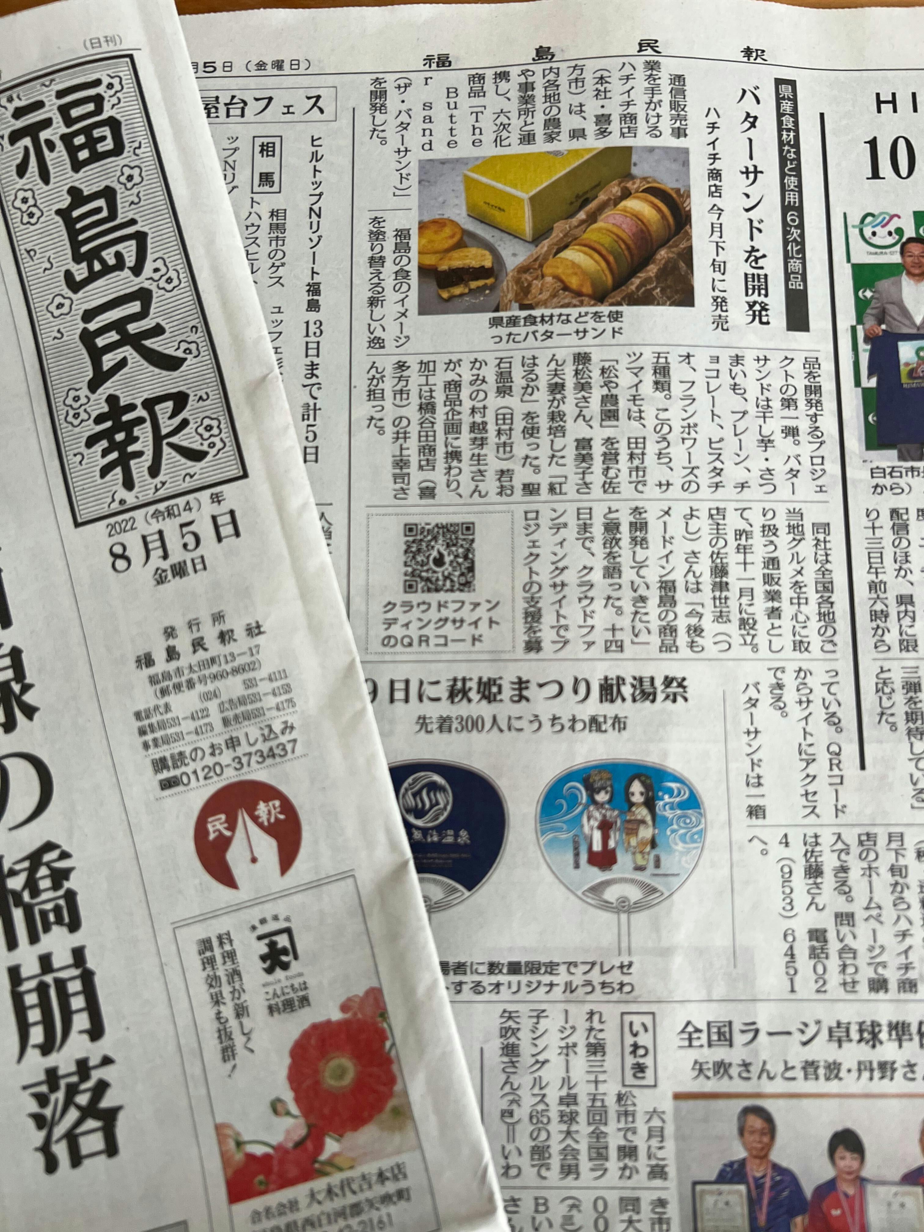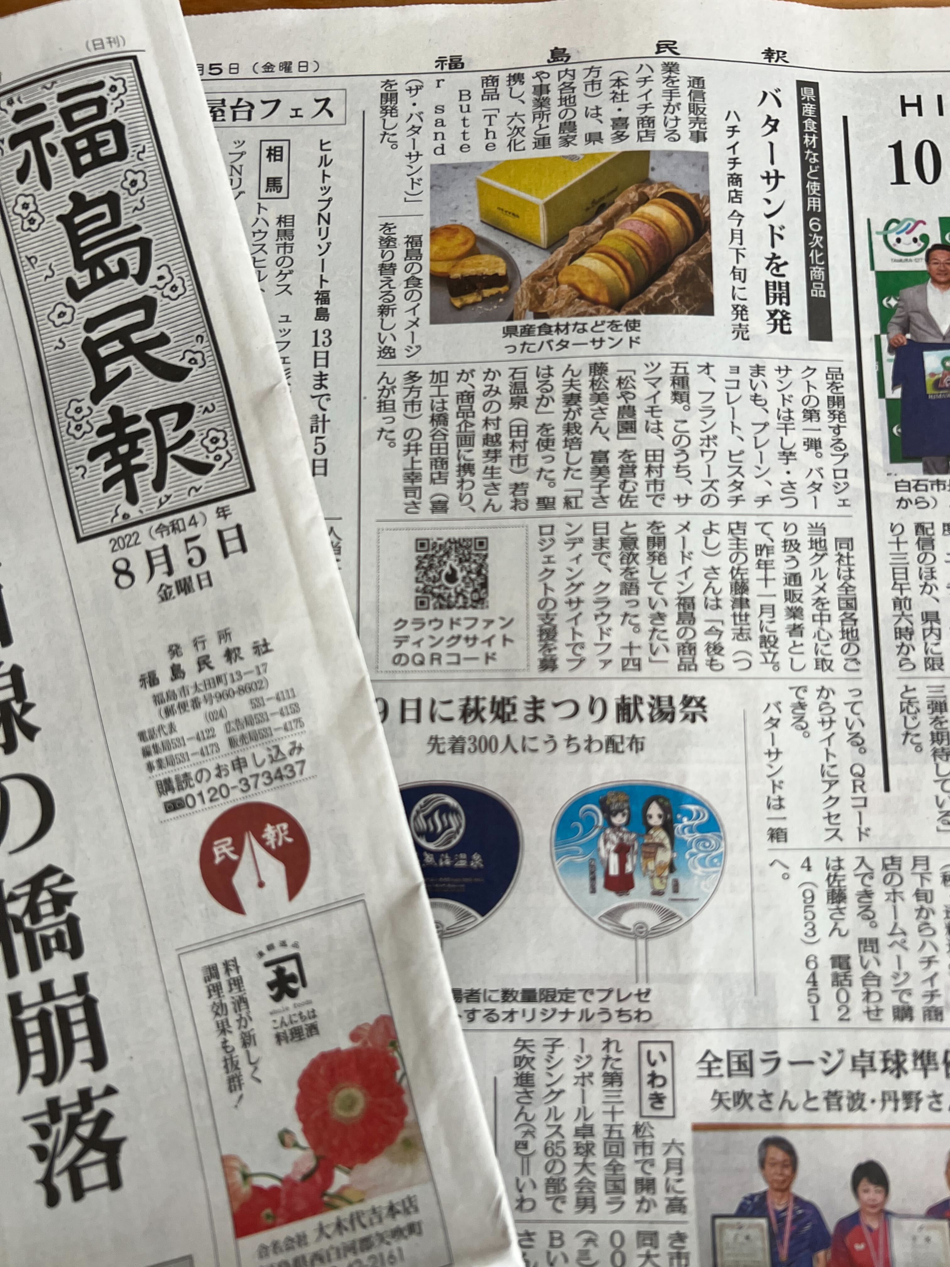 2022/08/05 12:30ハチイチ商店の佐藤です!先日の福島民友さんに続き、本日の朝刊で福島民報さんにも『The Butter sand(ザ・バターサンド』の取り組みを掲載して頂きました。福島民報さんの記事には、クラウドファンディングのQRコードも掲載していただきました!地元新聞の2社に取り上げて頂き、本当に嬉しい限りです。クラウドファンディングもいよいよ10日を切りました!ラストスパート頑張ります! もっと見る