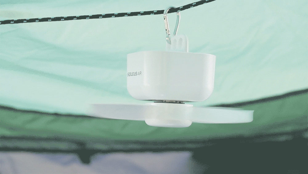 「SOLEUS AIR キャンプ用シーリングファン」は手軽に持ち運べるポータブルシーリングファンとして、キャンプ場のテント中やタープの天井、家中の壁や天井など好きな場所に吊るすまたは掛けて空気を循環させてくれるアウトドアアイテムです。(※直接風を当てれば扇風機としても使えますよ!)