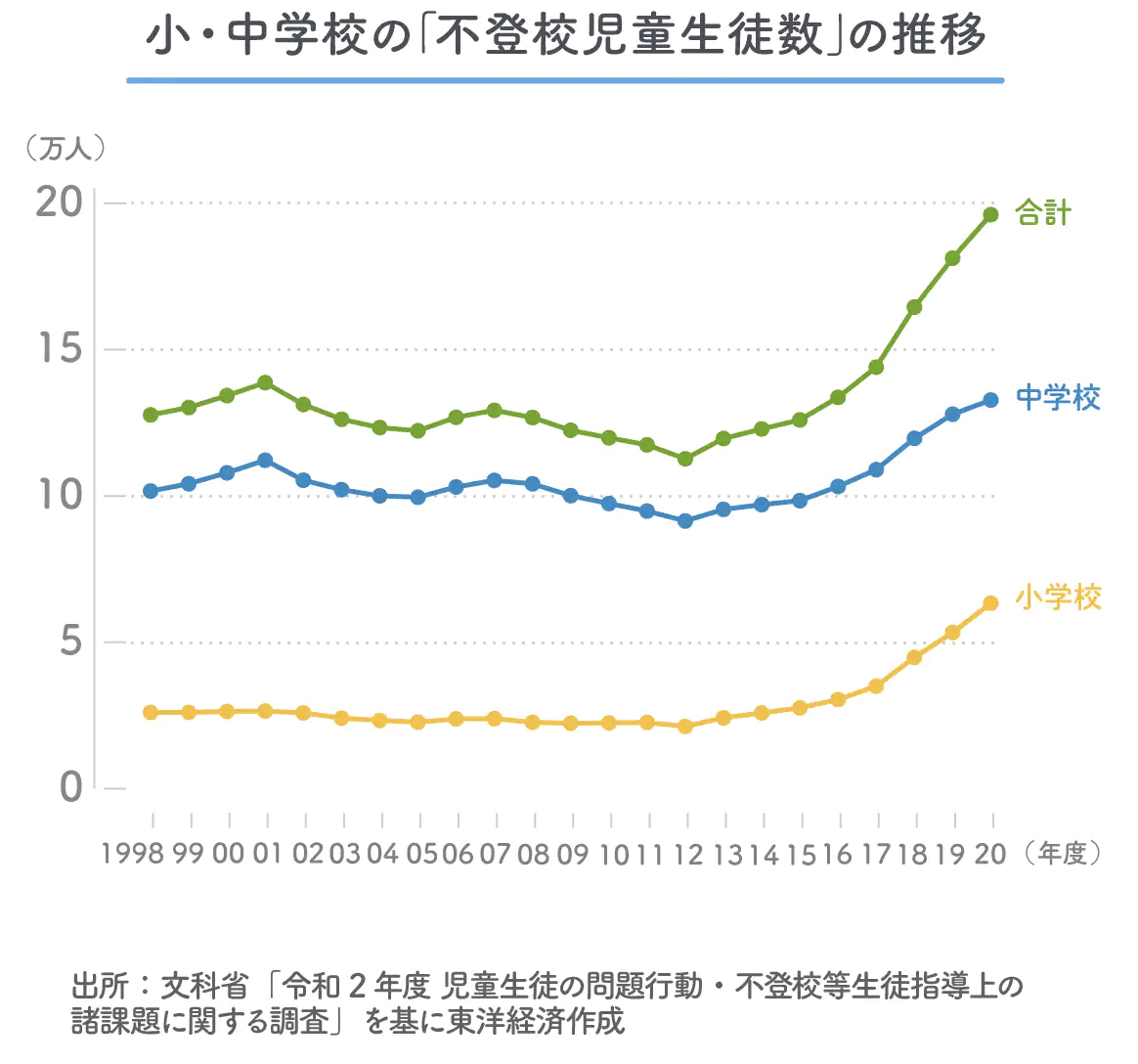 2020年現在、日本の小学生児童数は6,301,000人、内不登校児童は62,862人(10人に1人)。