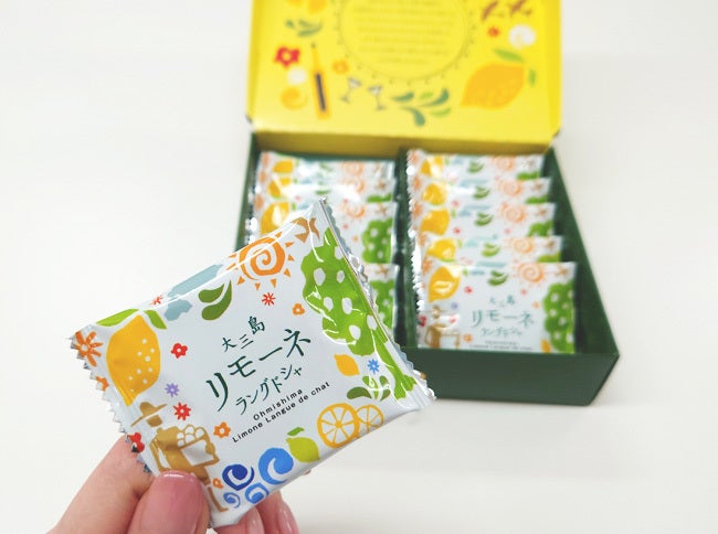 大三島リモンチェッロ入りのホワイトチョコを、サクサクのバタークッキーでサンドした軽やかなラング・ド・シャ。リキュールのアルコールをとばして、風味を残す仕上がりに。お酒感はないので、お子様でもお召し上がりいただけます◎