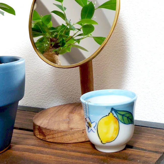 愛媛の伝統的な「砥部焼 千山窯」の絵付け氏が描かれたレモンのカップは一つ一つ手描きで味がある可愛さ♡大きさはぐい吞みサイズで、高さは約5cm。女性の手にもしっくりくる持ちやすさです。