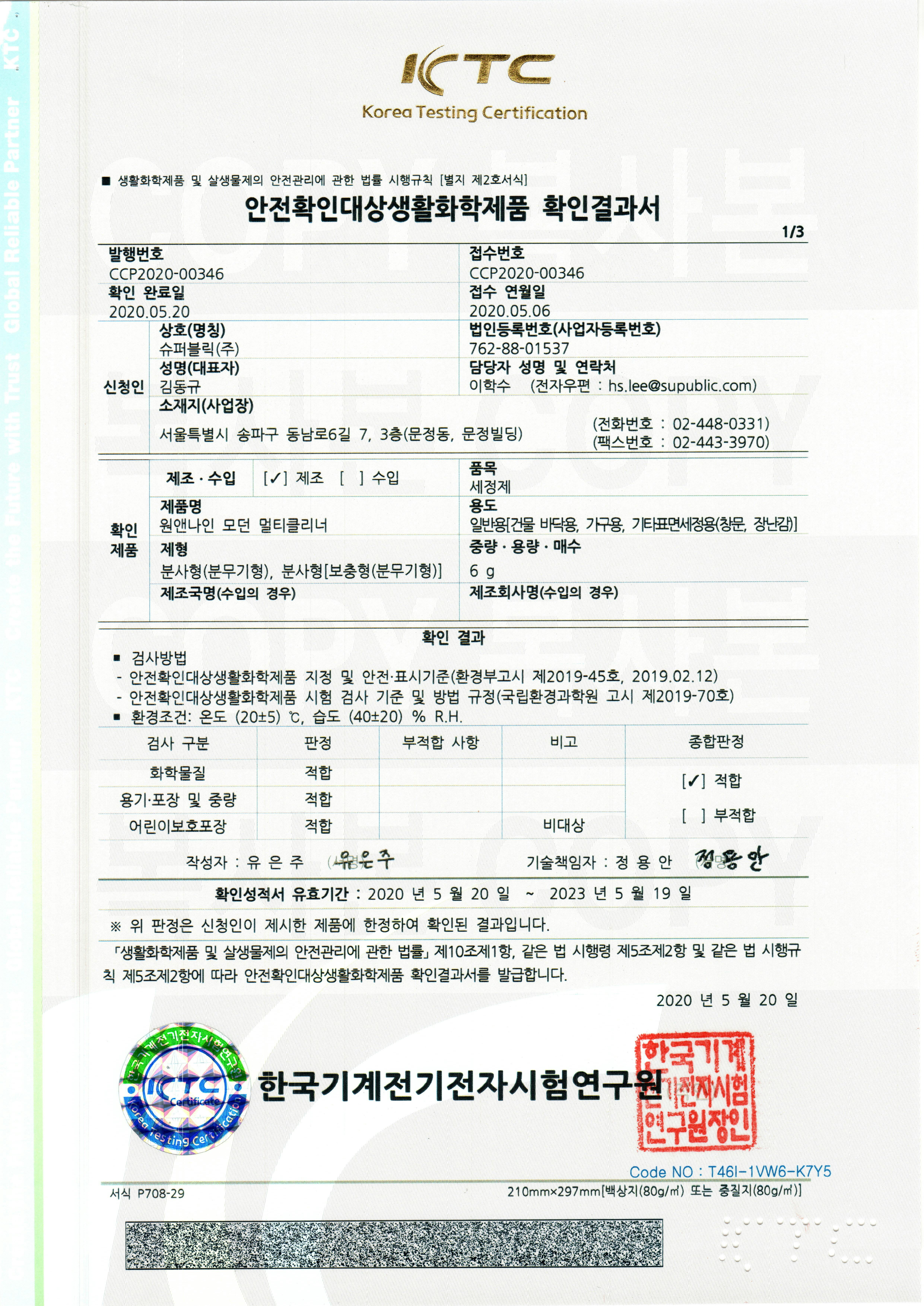 「生活科学製品及び殺生物剤の安全管理に関する法律」の第三者機関検査結果
