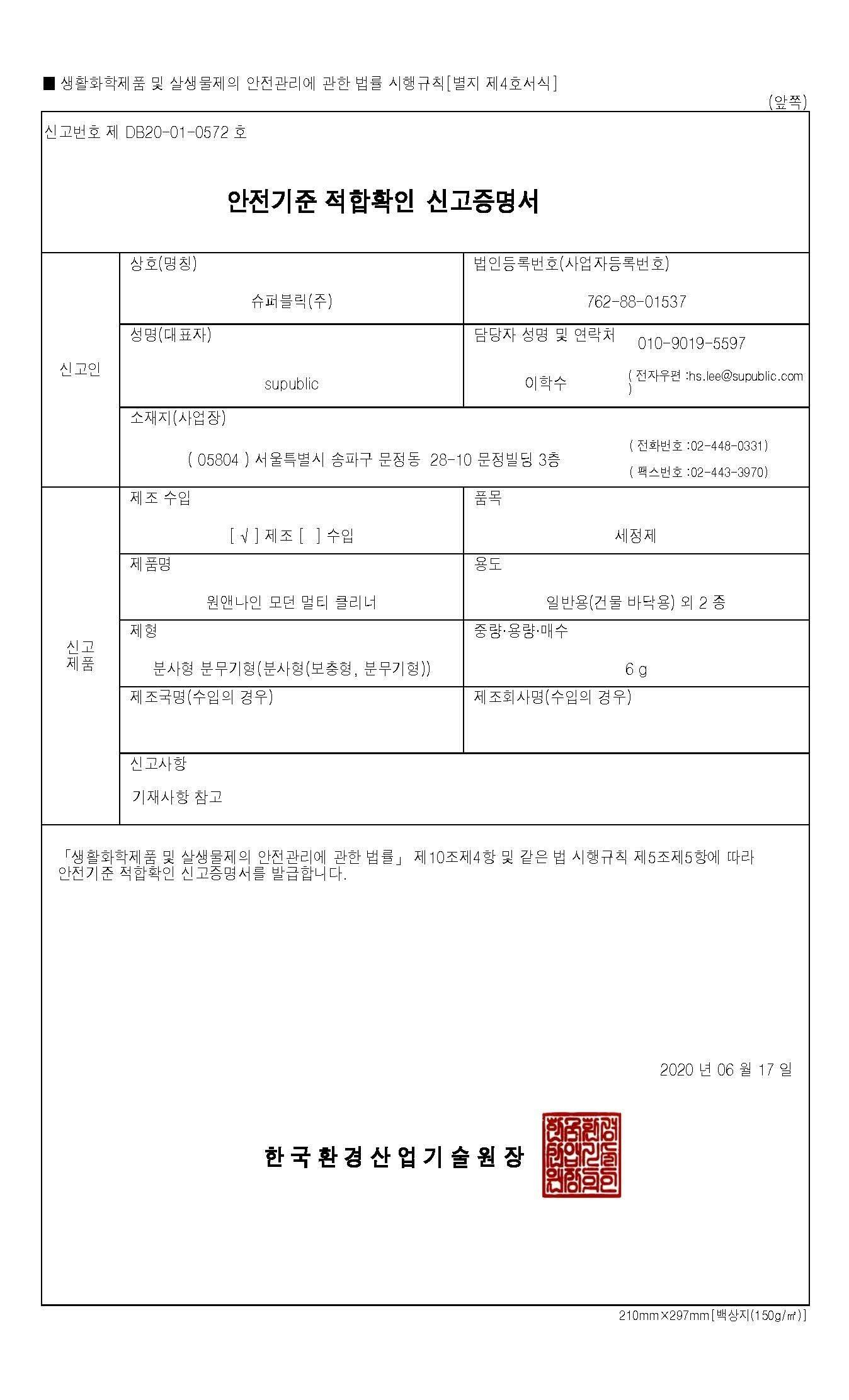 「生活科学製品及び殺生物剤の安全管理に関する法律」の安全基準適合確認届出証明書