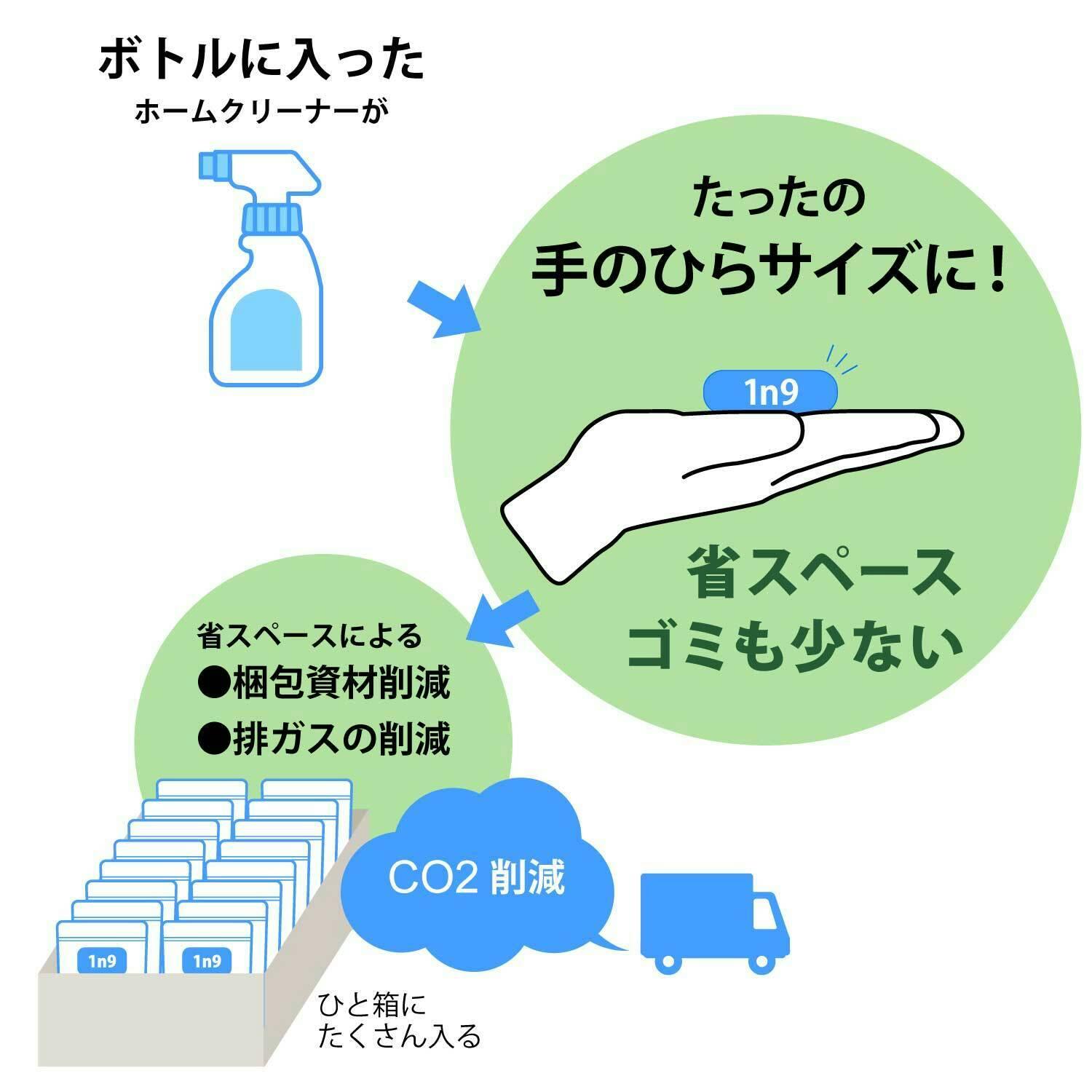 洗剤から水を省いたら収納スペース減、脱プラ、梱包輸送のコスト削減など良いことがいっぱい!サステイナブルなホームケア製品を作るべく、1n9ブランドはタブレット型ホームクリーナーを開発しました。重曹・クエン酸の他は全て自然由来成分で人にも自然にも優しい。1n9と地球に優しい生き方を考えてほしい。