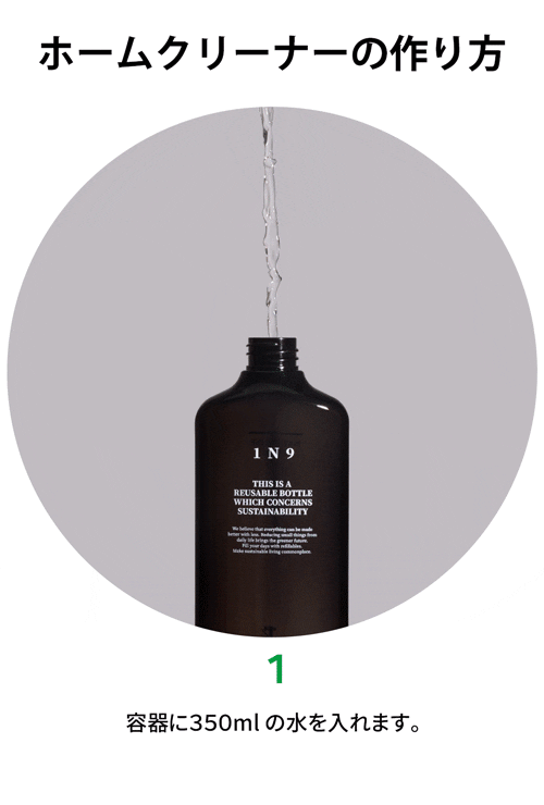 1n9(ワン・エン・ナイン)は自分で作るデイリーケア製品です。容器は何でもOK。1n9のホームクリーナー タブレットを水で溶かして完成です。