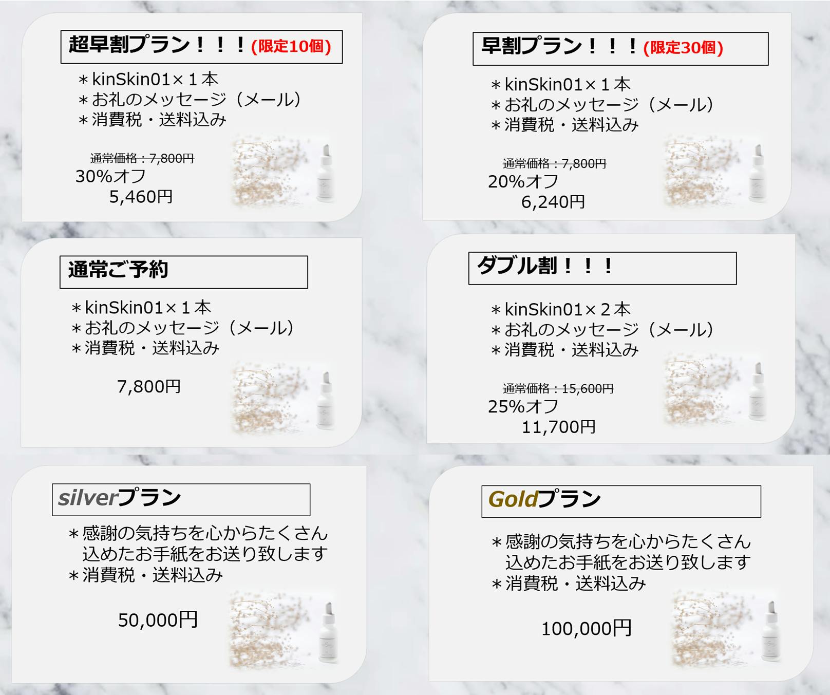 2022/07/29 10:29~【超早割!!!30%オフ】完売~キャンプファイヤー限定価格のプランが完売致しました!本当にありがとうございます!!プロジェクトスタートから2日目にして完売となり、嬉しさで胸がいっぱいです。皆様からいただきましたご支援は、リターンにてお返ししてまいりますので発送までもう暫くお待ちください。たくさんの温かいご支援を下さり、心から感謝・お礼を申し上げます。まだ【早割!!!20%オフ】プランや、【お買い得!2本セット】プランなど様々なリターンをご用意しておりますので、引き続きkinSkinをどうぞよろしくお願いいたします。 もっと見る
