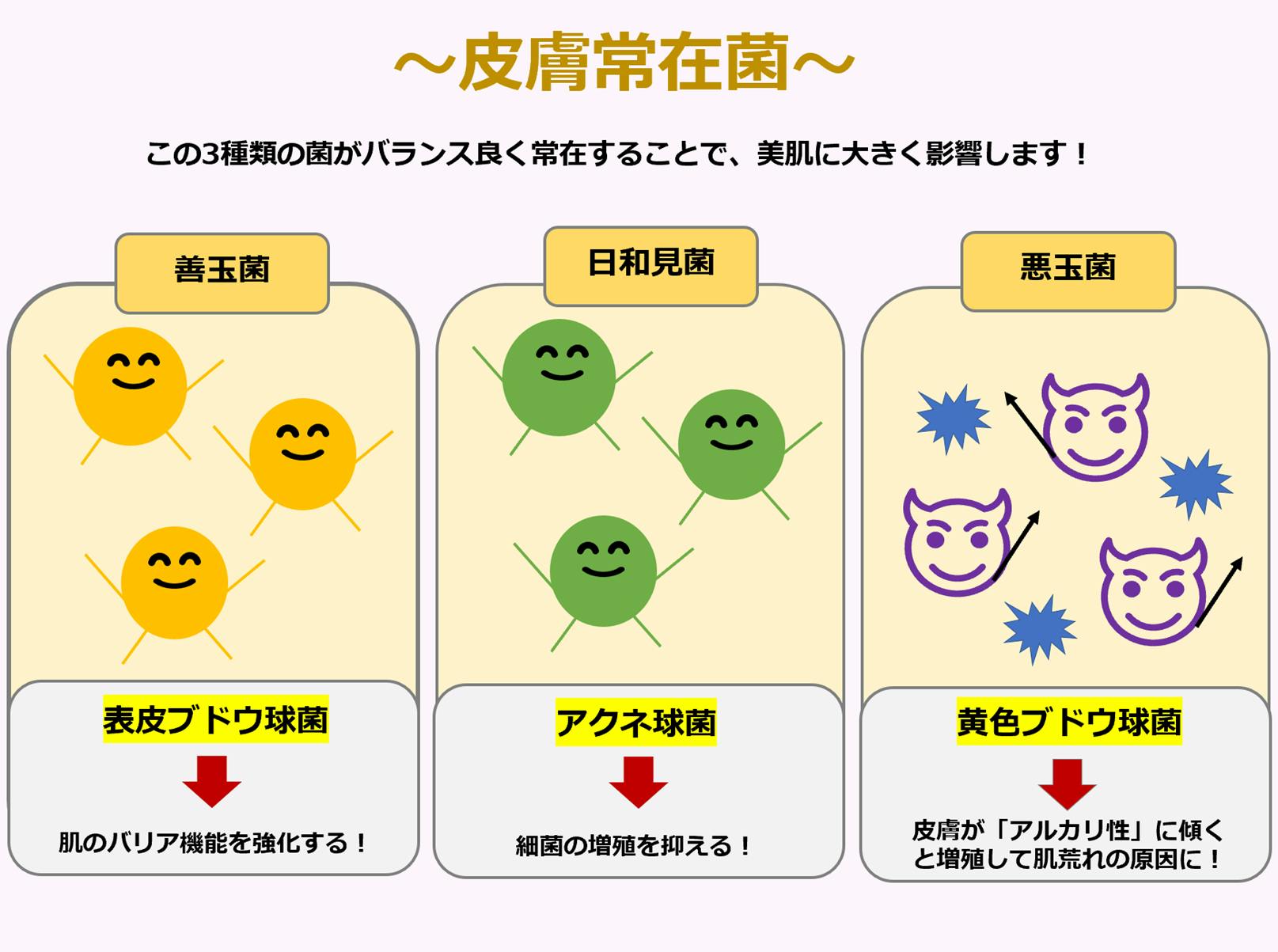「皮膚常在菌」には主に3種類に分けることができ、中でも「善玉菌」「日和見菌」「悪玉菌」のバランスが美肌に大きな影響を与えている為、この3つが「美肌菌」と呼ばれます。