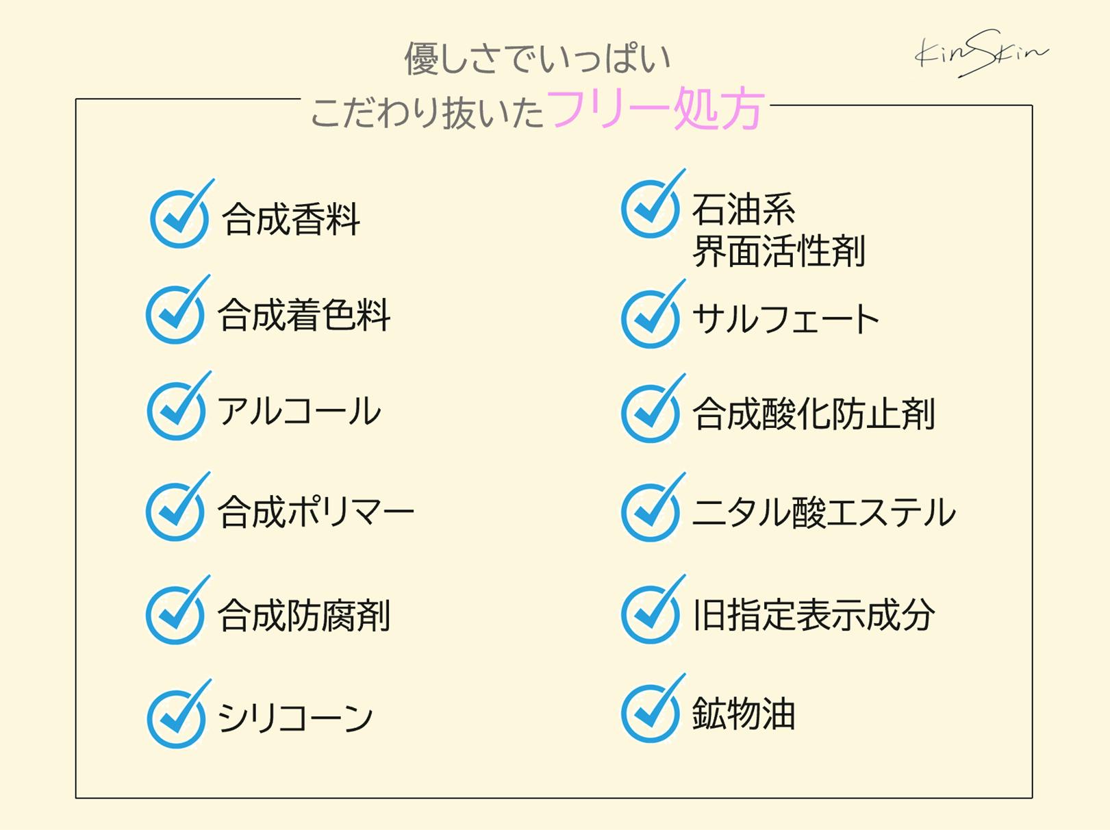 kinSkinでは、皮膚常在菌バランスの乱れを引き起こす懸念のある合成成分は一切使用せず、こだわり抜いた処方で作り上げました。赤ちゃんでも使える優しさ溢れる美容液は、人一倍敏感肌な私が重要視したポイントです。