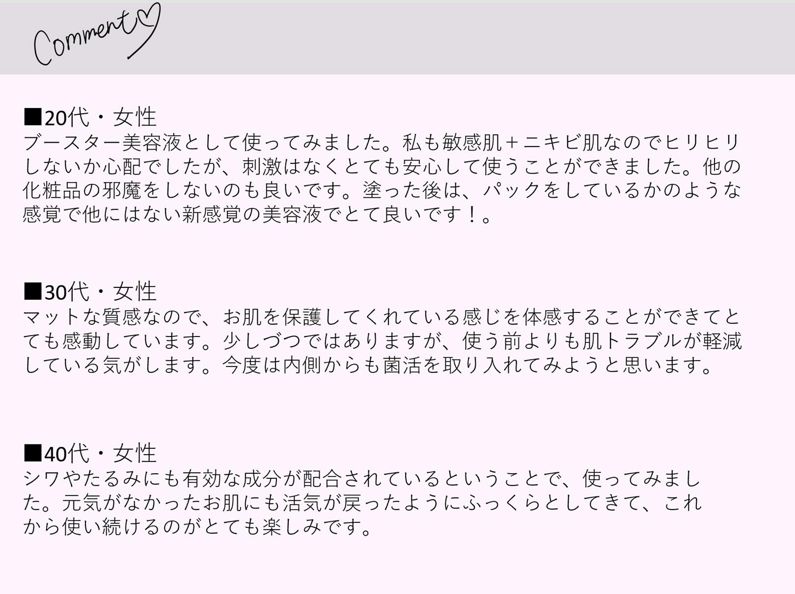 まるでパックを一枚つけているかのような菌のヴェールに包まれます。マットな質感の仕上がりが、他の美容液にはない”新感覚”な使い心地の美容液です。マットな質感ですが、次に使う化粧水の邪魔をせずお肌を整えてくれます。