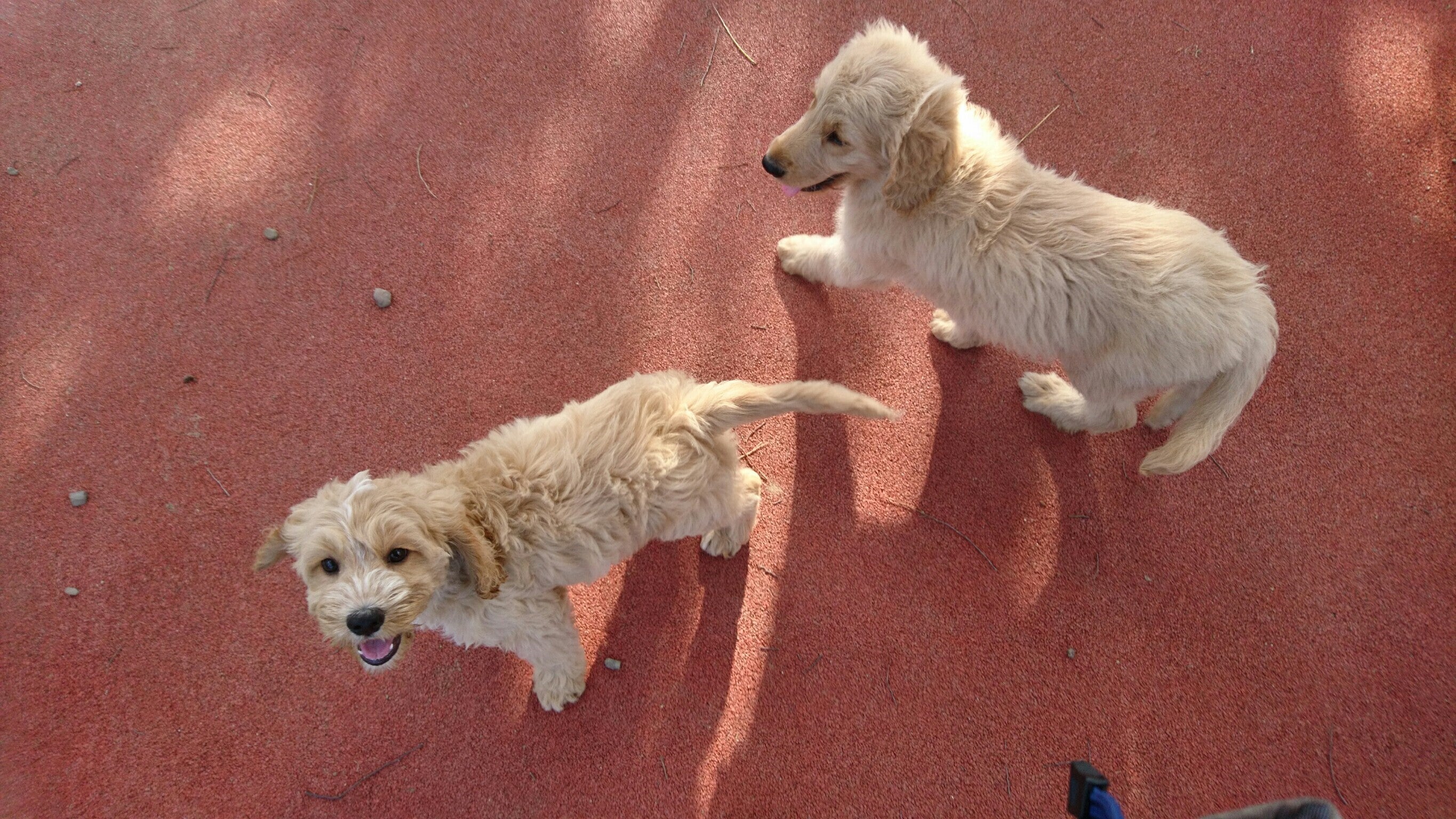 ▲ユーザーさん待ちで現在、聴導犬と介助犬のPR犬をしているよし君(左)と。介助犬になったしゅう君(右)