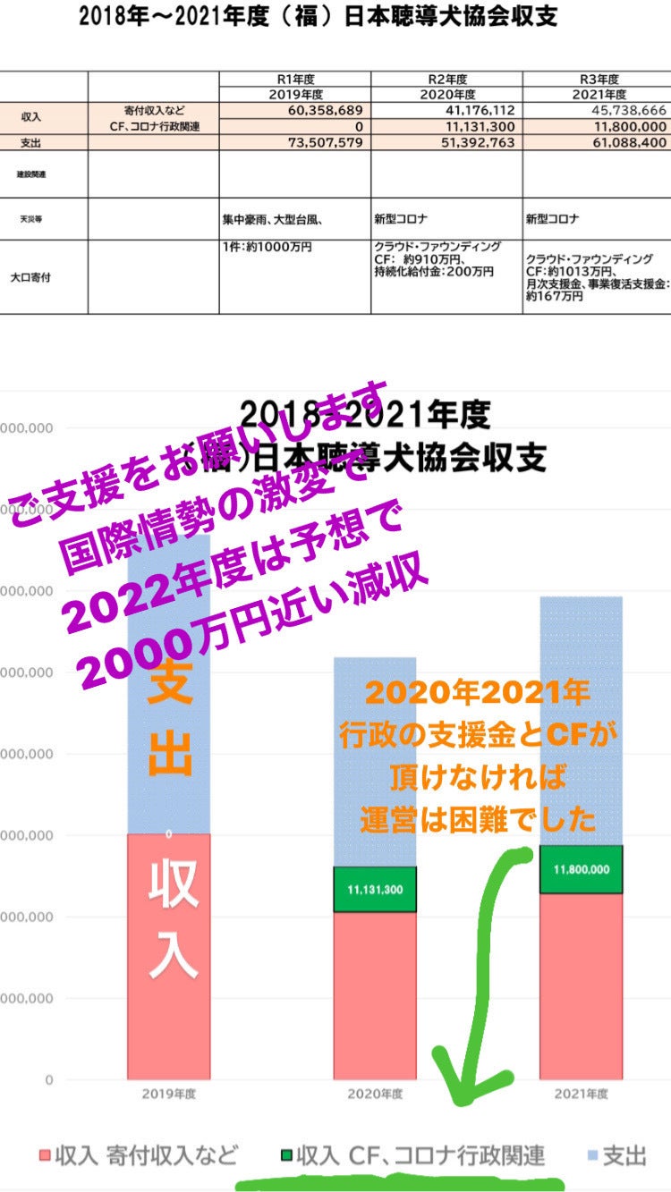 ウクライナの戦争など、世界中が大変な状況にある中で心苦しいのですが、聴導犬と介助犬の育成費用約1200万円(健康維持のための良質なフード、獣医療費用や衛生管理費など)のうち、750万円をクラウドファンディングで呼びかけなくてはならなくなりました。このままですと、20224年4月~7月の収支で計算しますと、例年の約2000万円の減収と予想されています。