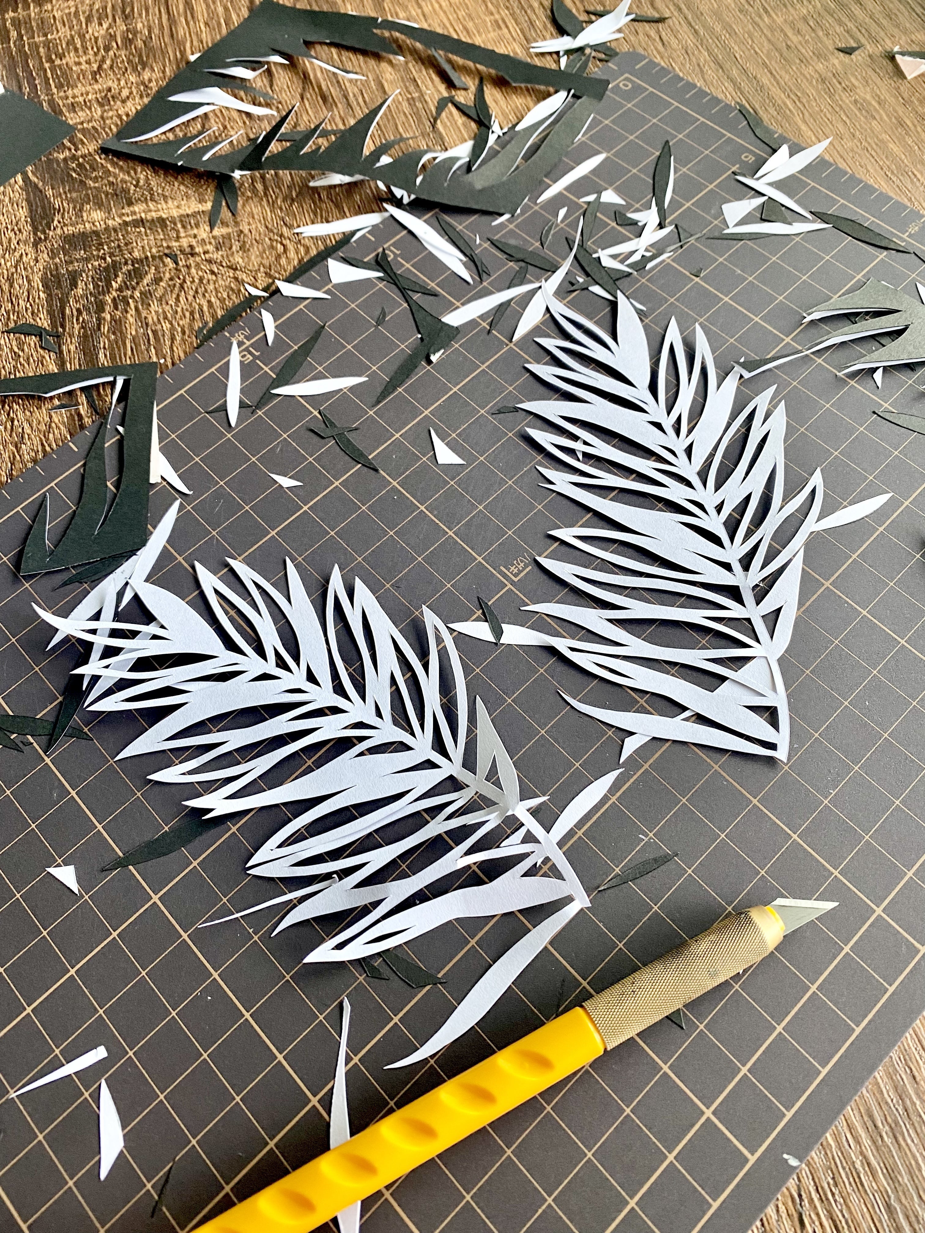 リターン品を心を込めて制作させて頂いております。少し机が荒れてる画像で申し訳ありませんが、《gen-ki -アレカヤシ-》の切り絵制作後の写真です^^