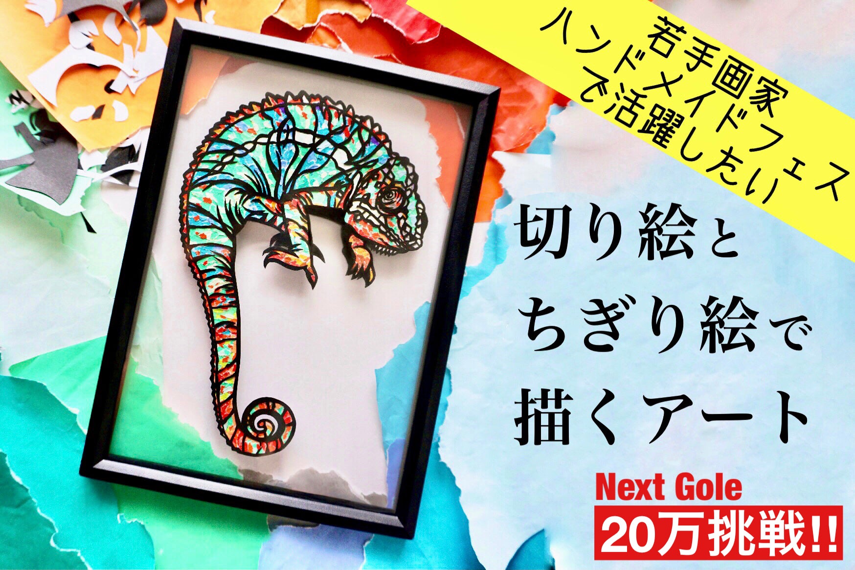 まだ名の知れない作家に対し、たくさんの方にご支援を頂き感謝の気持ちでいっぱいです。本当にありがとうございます…!また、“紙のおくりもの”を知って頂ける機会が増えたような気がして、とても嬉しく思っております。20万と強く出ましたが、理由としては、“紙のおくりもの”を多くの方に知ってもらい、手に取って頂けたら幸せと思ったからです。全て限定の枚数でリターン品をご提供させて頂いております。そのリターン品が全て無くなること、を目標と致しました。⬛︎もし20万達成したら…今回は、起業での経験不足や金銭面等で諦めた、次回のフェスでのワークショップの資金に充てたい!と考えています!ハンドメイドフェスでは、体験してもらいながらその良さを知って頂けるブースも用意されています。“紙のおくりもの”を身近に感じて頂けるように、【ちぎり絵】を描けるブースを設けてお子様から大人の方まで楽しめるワークショップをご提供したいです!(切り絵は刃物なので、私からの“紙のおくりもの”にさせて頂く予定です)まだまだ思い付きでしかありませんが、いつかそのような体験ブースを用意できるような存在になり、多くの方に喜んで頂ける活動をしたいです!!⬛︎リターン品の追加のお知らせ思い切ってネクストゴールを20万に挑戦したこと、また、たくさんの方に目を通して頂きご支援頂いたことへの感謝の意を込めて、thank you(39)価格で、紙切ちぎりが愛用しているカメレオンのA4サイズをご用意させて頂きました。限定1枚となります!ネクストゴール目指して、今までの作品やフェスの準備の投稿をし、見て頂いてる皆さんに楽しんで頂けるよう頑張ります!よろしくお願い致します!紙切ちぎり✴︎Instagram✴︎ Twitter✴︎ Pinterest✴︎ YouTube