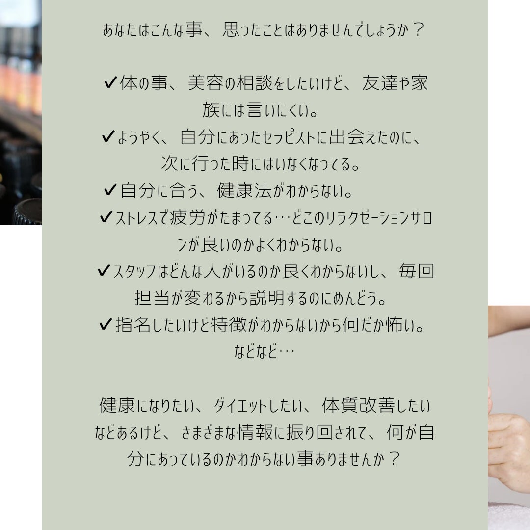 皆様には安心して『マイセラピスト』を見つけ、生活の中に、習慣ケアを取り入れて体のメンテナンス、食事療法など、体をマネジメントし健康的な生活を過ごして頂きたいと思います。