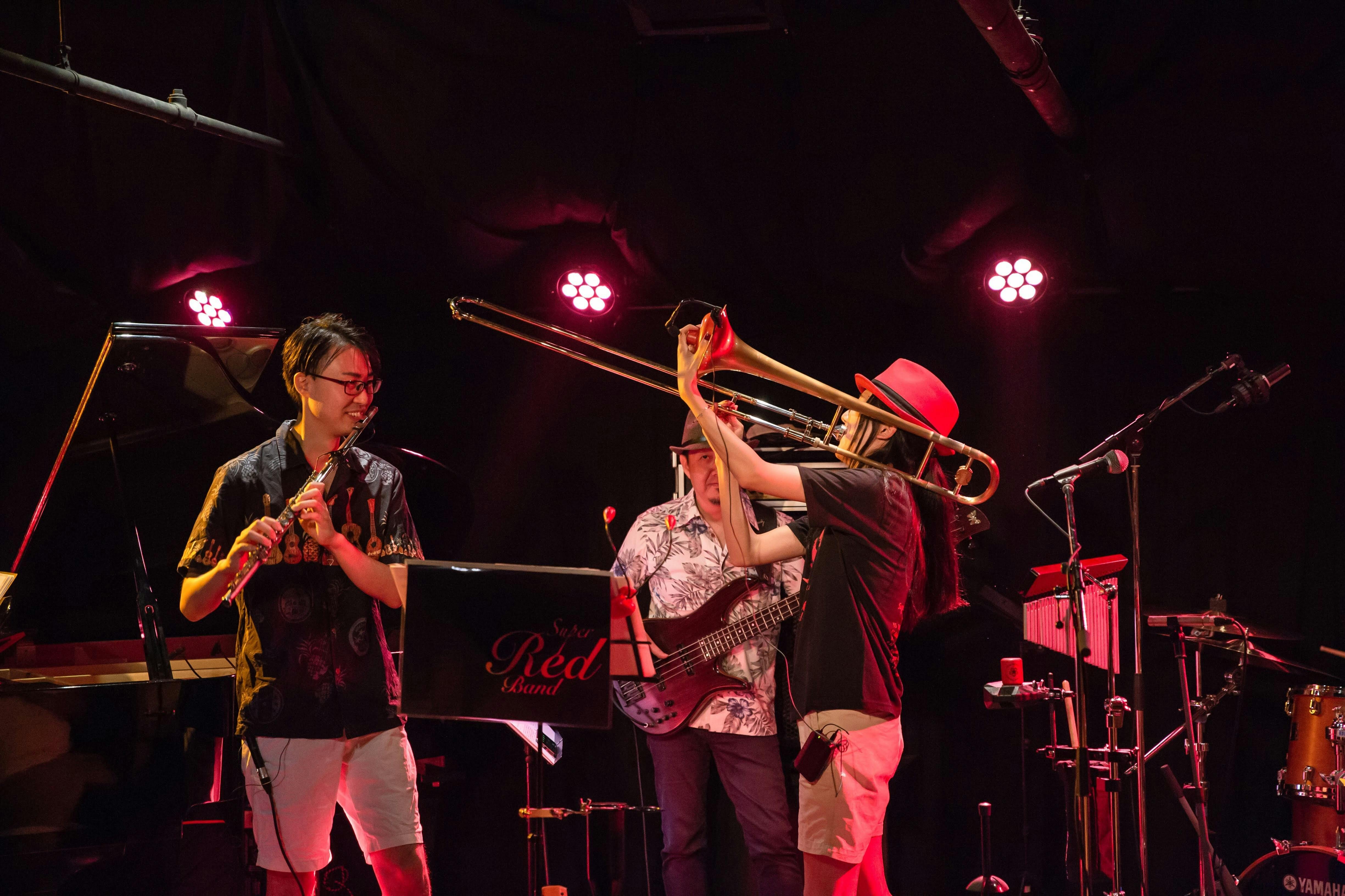 Super Red Bandは、フルートとトロンボーンというちょっと風変わりな2フロントに、ピアノ・ベース・ドラムからなるクインテット編成のインストバンドです。ジャズ、R&B、ラテン、フュージョン等の要素を取り入れ、肩肘張らず老若男女に楽しんでいただける音楽、笑顔になってもらえるライブを目指し活動してきました。