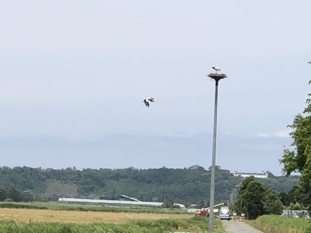 残念ながら雛の誕生とはなりませんでしたが、日本コウノトリの会の方によると、1棟目の人口巣塔(津幡塔)の近くには新たに千葉生まれと兵庫生まれの若いカップルが飛来しているようです。