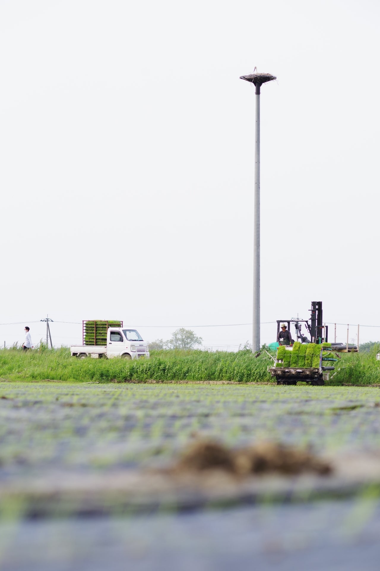 人工巣塔から有機米の田植え作業を見守るコウノトリ