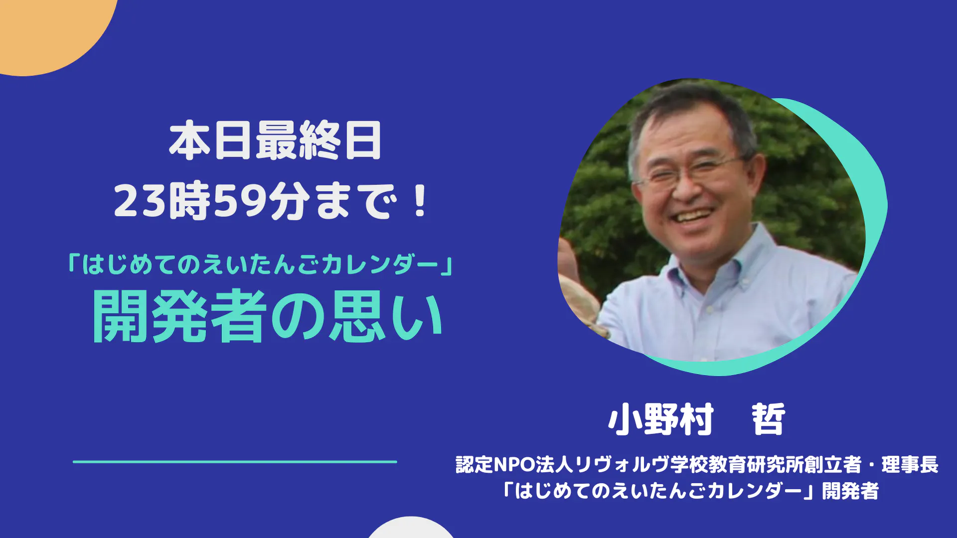 本日は、「はじめてのえいたんごカレンダー」開発者、認定NPO法人リヴォルヴ学校教育研究所創立者・理事長でもある 小野村 哲(おのむらさとし)より、英語教材の開発に寄せる思いをお伝えします。