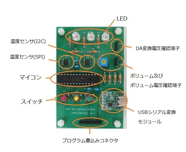 PCからUSBを通じて電源供給および通信を行います。基板にはマイコンはじめスイッチやLEDおよび2種類の温度センサ、ボリュームなどを搭載し、マイコンの持つ一通りの機能を確認できるようになっています。