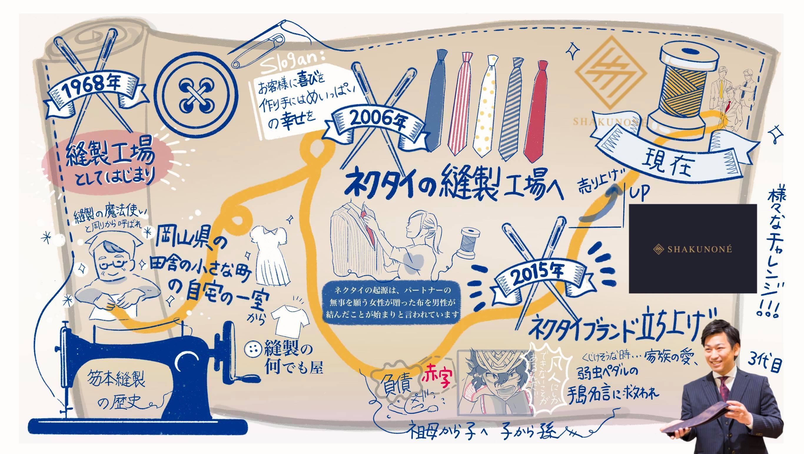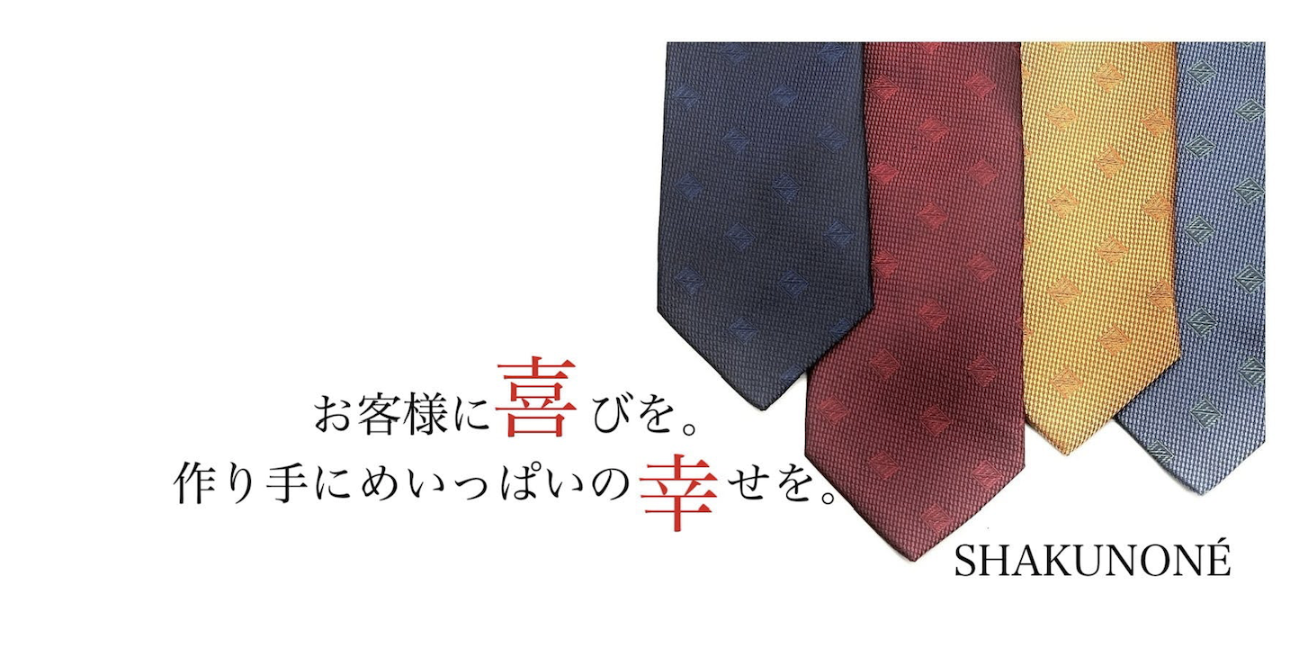 弊社は岡山県津山市にある、僕の祖母が54年前に自宅の一室で創業した小さなネクタイ縫製工場です。つい最近までは無名の縫製会社で、表舞台に出ることのない縁の下の力持ちに徹して、ずっとモノヅクリを支えてきました。そんな中で大きな転機を迎えたのが2015。長年培ってきた「縫製職人の技術」に「デザイン力」と「お客様との対話」を取り入れ、 オリジナルネクタイブランド【SHAKUNONE(シャクノネ)】を生み出しました。私たちにとっては大きな挑戦でしたが、おかげさまで多くの方に支えていただきながら、今日までブランドを育ててきました。