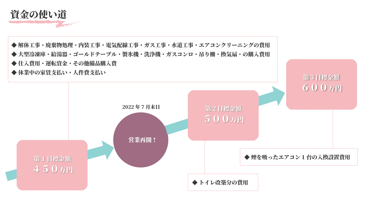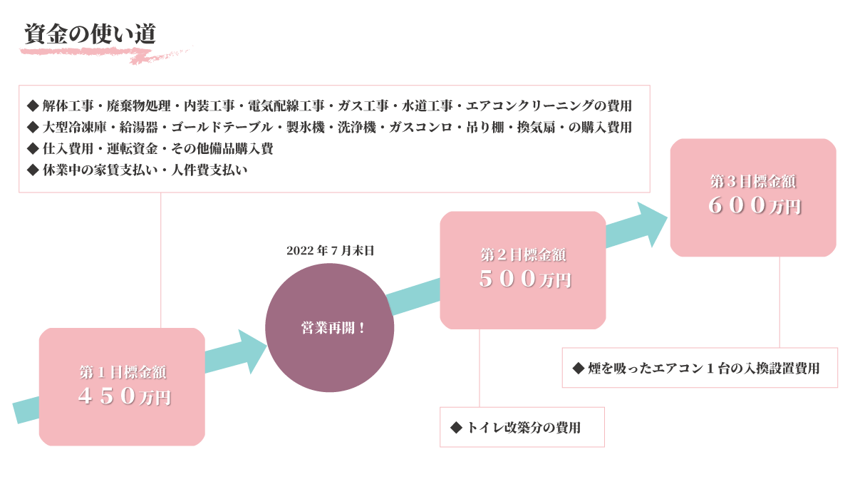 本プロジェクトは、期日までに集まったご支援金総額に応じて、実行内容の規模を決定させて頂きます。厨房設備の準備状況により、やむを得ず再開時期が延びる可能性もございますが、その場合も、頂いたご支援金は同様の使途に充当させて頂きますので、返金は致しかねます事、何卒ご了承くださいますようお願いいたします。尚、進捗状況につきましては、本サイトで適宜ご報告致しますことをお約束いたします。
