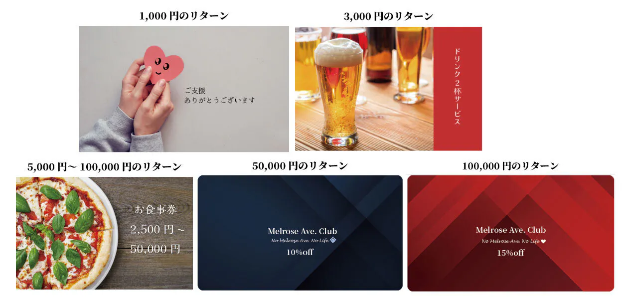 ご支援いただいた金額により、ドリンクサービスやお食事券、割引特典のついたメルローズ・アベニュークラブカードなどを提供させていただきます。