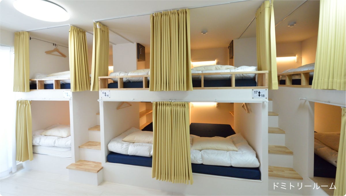 『男女共用ドミトリー』と『女性専用ドミトリー』があり、どちらも半カプセルタイプでプライバシーはしっかり確保、こだわりの2段ベッドはハシゴではなく階段を採用し上の段でも安心安全にご利用いただけます。