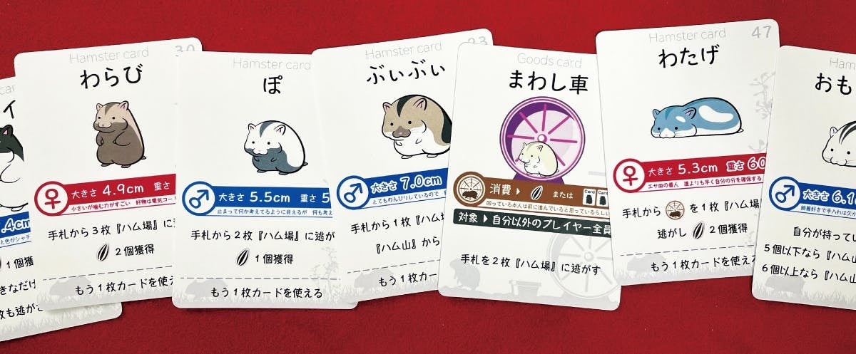 手札をプレイして効果を発動し、勝利点を稼ぐタイプのオーソドックスなルールで、たくさんのハムスターたちと協力し、時にはグッズカードを使って戦略的に展開を進めてヒマワリの種を10個集めるというハムスターらしいテーマになっています