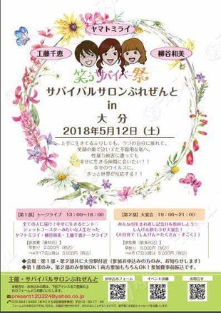 2018/04/03 11:32皆様のご支援のおかげで、本日プロジェクト達成しました!! 直接お声かけして応援してくださったり、昔からご支援いただいてる方、知り合って間もない方、このプロジェクトで初めてコンタクトしてくださった方… つい2ヶ月前までの私には信じられない体験です(o’∀’o) 大分イベントもますます楽しみになりました☆ しつこく告知しますね(笑) サバイバルサロンぷれぜんと in 大分 ~~~~~~~~~~~~~~~ 上手に生きてるふりしても、ウソの自分に疲れて、笑顔の奥で泣いてた不器用な私へ 【笑うサバイバー祭〜幸せのウイルスに、きっと世界が反応する〜 】 第1部 全ての人に届け!幸せに生きるヒント♡ ジェットコースターみたいな人生だった私たちトークライブ〜行き先よりも大事な出逢いに導かれて、 未来はきっと変わっていく〜 第2部 みんなの生まれ直し記念日を乾杯しよう☆しんけん飲もうぜ大宴会〜みんなで笑って過ごせるなら、それだけでいい〜 ~~~~~~~~~~~~~~●2018年5月12日(土) 【第1部】トークライブ 13:00-16:00 【参加費(資料代)】早割り 2,000円(税込)⇒4月17日以降は 3,000円(税込) 【第2部】大宴会 19:00-21:00【参加費(飲食代込)】早割り 6,000円(税込)⇒4月17日以降は 8,000円(税込) ●①のみ、②のみ参加OK! 両方参加ももちろんOK!中学生以下は無料です。 ●三菱東京UFJ銀行または、ゆうちょ銀行へのお振込を先払いでお願い致します。 振込先は、お申込フォームより参加申し込後に、ご入力いただいたメールアドレスへ、返信いたします。振込手数料はお客様にてご負担願います。 ●参加費のお振込み確認後、お申込み完了、会場のご案内となります。 ●遅れて来た場合の、料金の割引や払い戻しはございません。ご了承くださいね。 ●会場大分駅近く(第1部・第2部ともに)(お申込み後、参加費お振込み完了した方にお知らせいたします) ●お申込み↓こちらのフォームより、お申込みください。https://ws.formzu.net/fgen/S38405066/ ●参加資格についての確認や、参加にあたっての不安な点、別の参加費の支払い方法を希望したい、日程が差し迫ってのお申し込み希望など、確認したいことがある場合は、以下のフォームからお問い合わせください。 https://ws.formzu.net/fgen/S78254345/ ※こちらからの返信は、パソコンのメールアドレスからの送信となります。携帯電話メールからお問い合わせの場合はpresent120324@yahoo.co.jpを受信可能な設定にしておいてくださいますようお願いいたします。 ******************** もっと見る