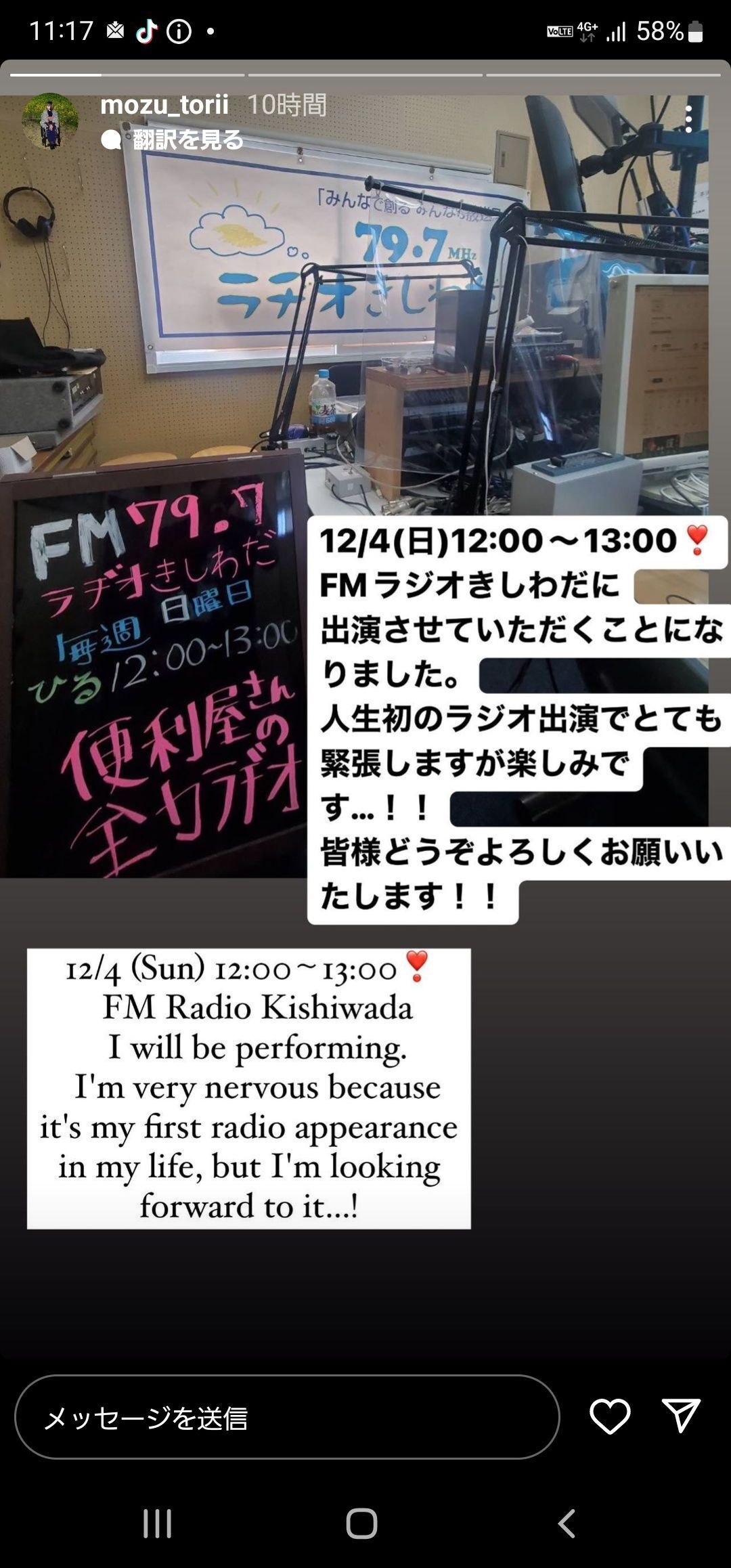 https://www.radiokishiwada.jp/皆様、いつも応援していただきありがとうございます!さて、明後日の12/4日曜日12~13時FM79.7ラヂオきしわだの“便利屋さんの全力ラヂオ”に、ゲスト出演してきます!初めてのラジオ、かなり緊張します。。。人前で話すのは苦手なので、克服するためにも経験をつんできます!多分、ガチガチの私なので色んな意味で面白いはず!!アプリなどでは視聴が出来ないので、リンクページ右上の“聴く”ボタンを押して是非是非聴いてくださいっ!レアなもずの声を聴けるチャンス!そして、こちらのプロジェクトも折り返しに差し掛かってきました。皆様のお陰で現在67%です☆ありがとうございますm(_ _)mもし、皆様のお手数でなければ、SNSや口コミの共有や、話のネタなどでもいいので、まだ知らない方にもこちらのプロジェクトを伝えていただきたいです☆あとは、通りすがりや共有していただけた方にお気に入りだけでもしていただけたら、もずは幸せです!こんな至らないもずですが、これからも何卒宜しくお願いいたしますm(_ _)m