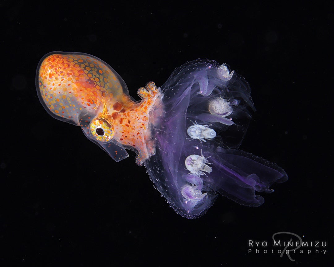 オキクラゲに乗ったムラサキダコの幼体と出会いました。サイズは1.5センチほど。クラゲを上手に引っ張って泳いでいました。この行動は、おそらくクラゲを防御の道具として使っているのだと思われます。よく見ると、クラゲには沢山のクラゲノミたちが暮らしています。