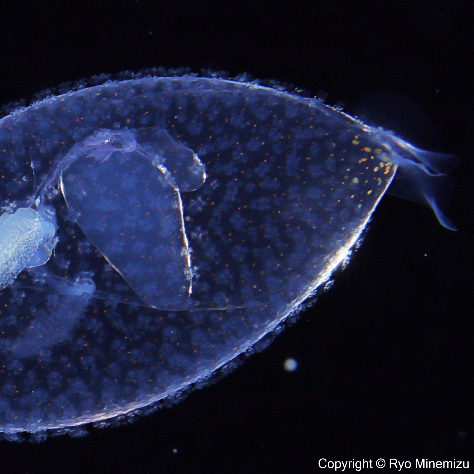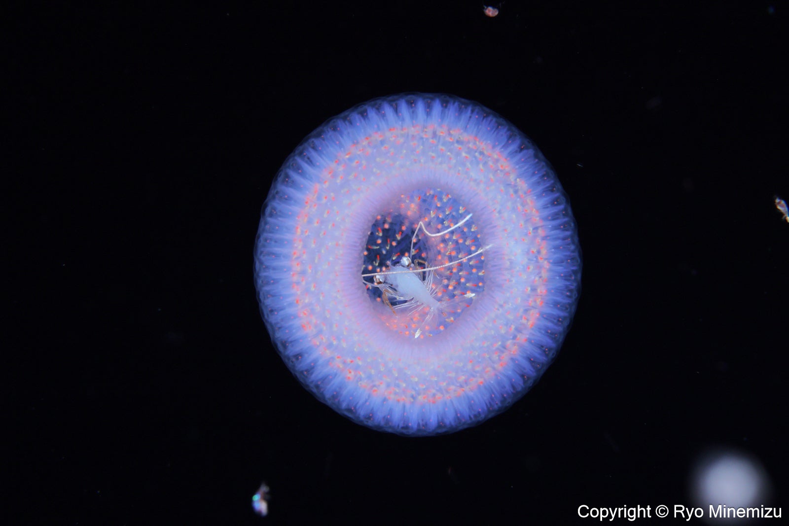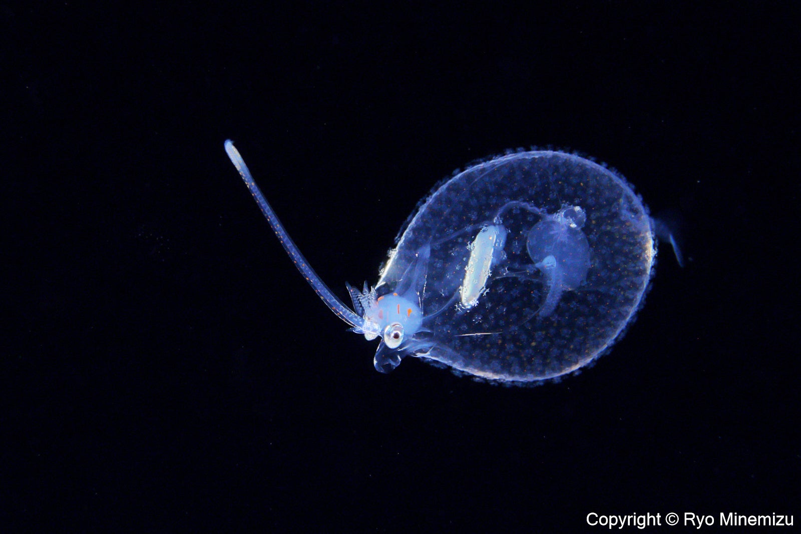 夜の海にはまさに神秘的な世界が広がっています。今回はこのつるっとしたタイプのヒカリボヤ とウキエビ Funchalia taaningi Burkenroad, 1940 の組み合わせが多かったです。このつるっとしたタイプのヒカリボヤ、早く名前を確定したいです。よく見ると、小さな小さなウキエビのメガロパ幼生たちも成体と一緒のヒカリボヤの中に何匹か居るのが写っていました。ウキエビはクルマエビ科の一種なので、卵を直接海に放つタイプの産卵をします。そのため、幼生は比較的早い段階から、偶然見つけたヒカリボヤに入って中で暮らしているのではないかと思います。成体もそれはあえて排除しないようですね。