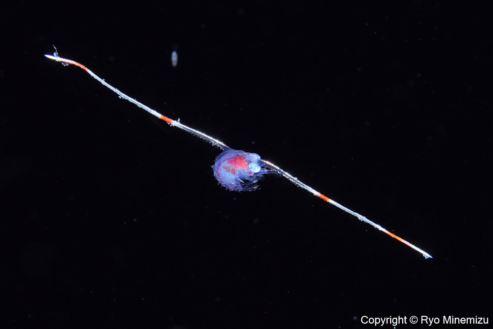 調査期間中に複数個体確認できたアサヒガニ科 Raninidae の一種のゾエア幼生です。全長37mmほどと大型で、巨大な棘には前後に2か所ずつ赤い模様があるのが個性的です。詳細な種名までは、今のところ確定できていません。詳細がわかり次第、追ってご報告させていただきます。
