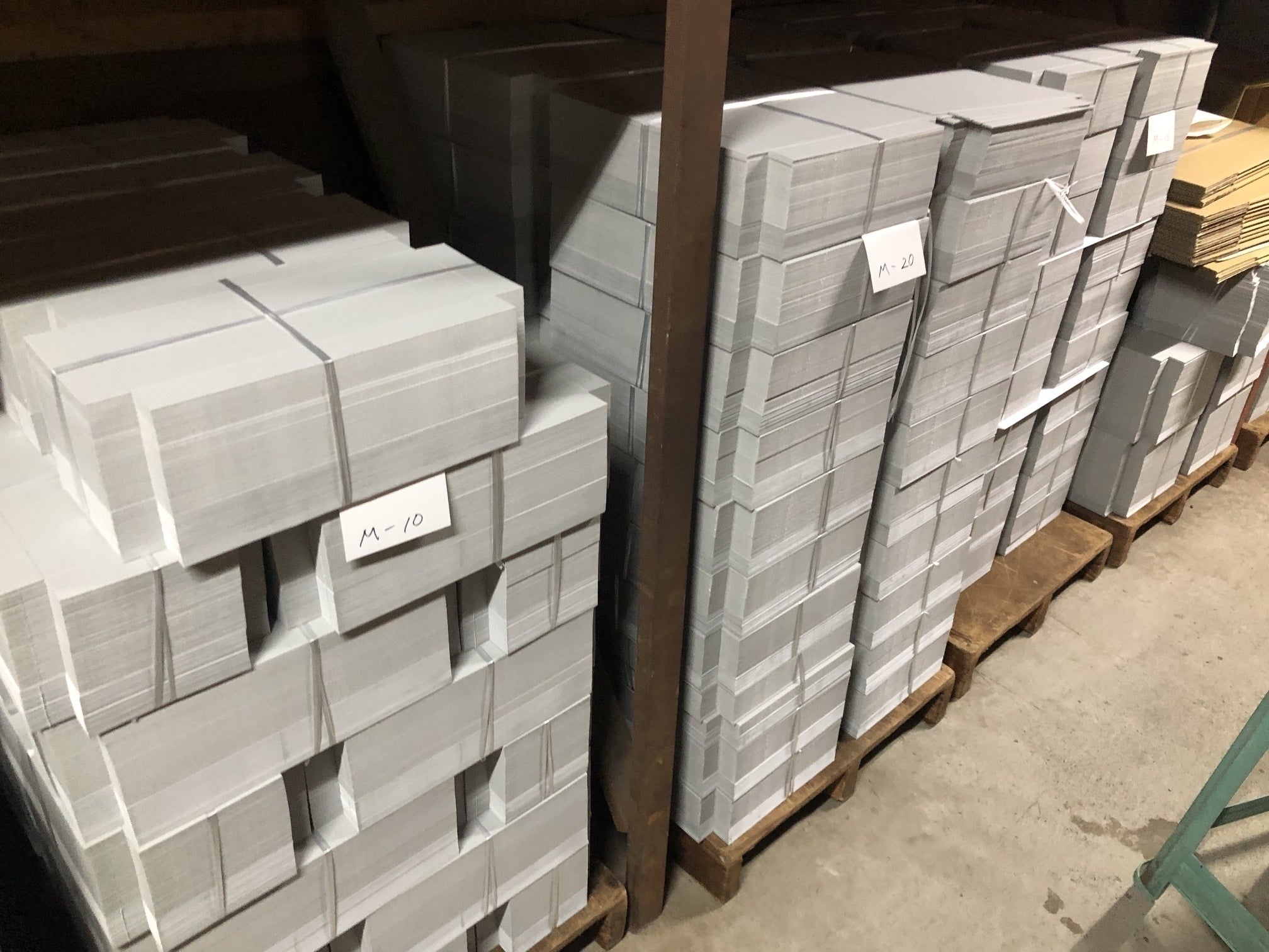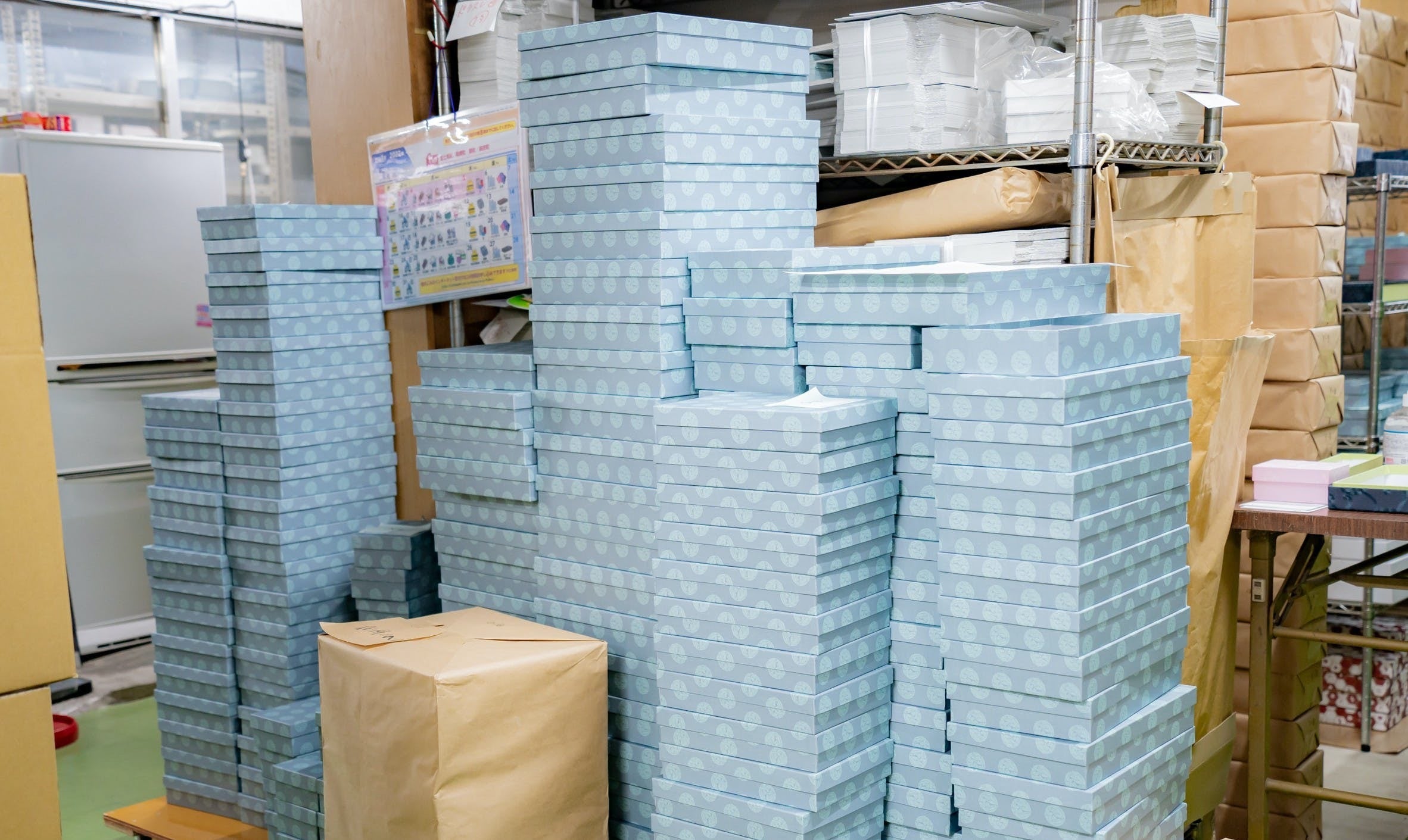 急に取引先の菓子屋さんが倒産してしまい、現在約5.8万もの箱が行き場を失っています。社長に今の気持ちをお伺いしたところ、今まで取引を続けてくれたことへの感謝の気持ちでいっぱいだと話してくれました。