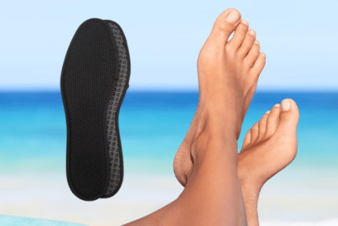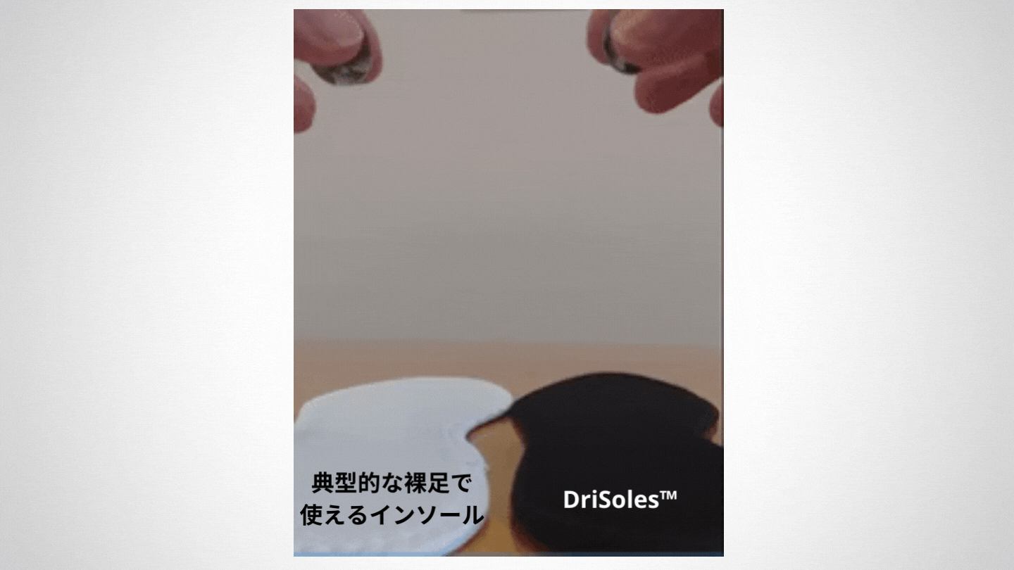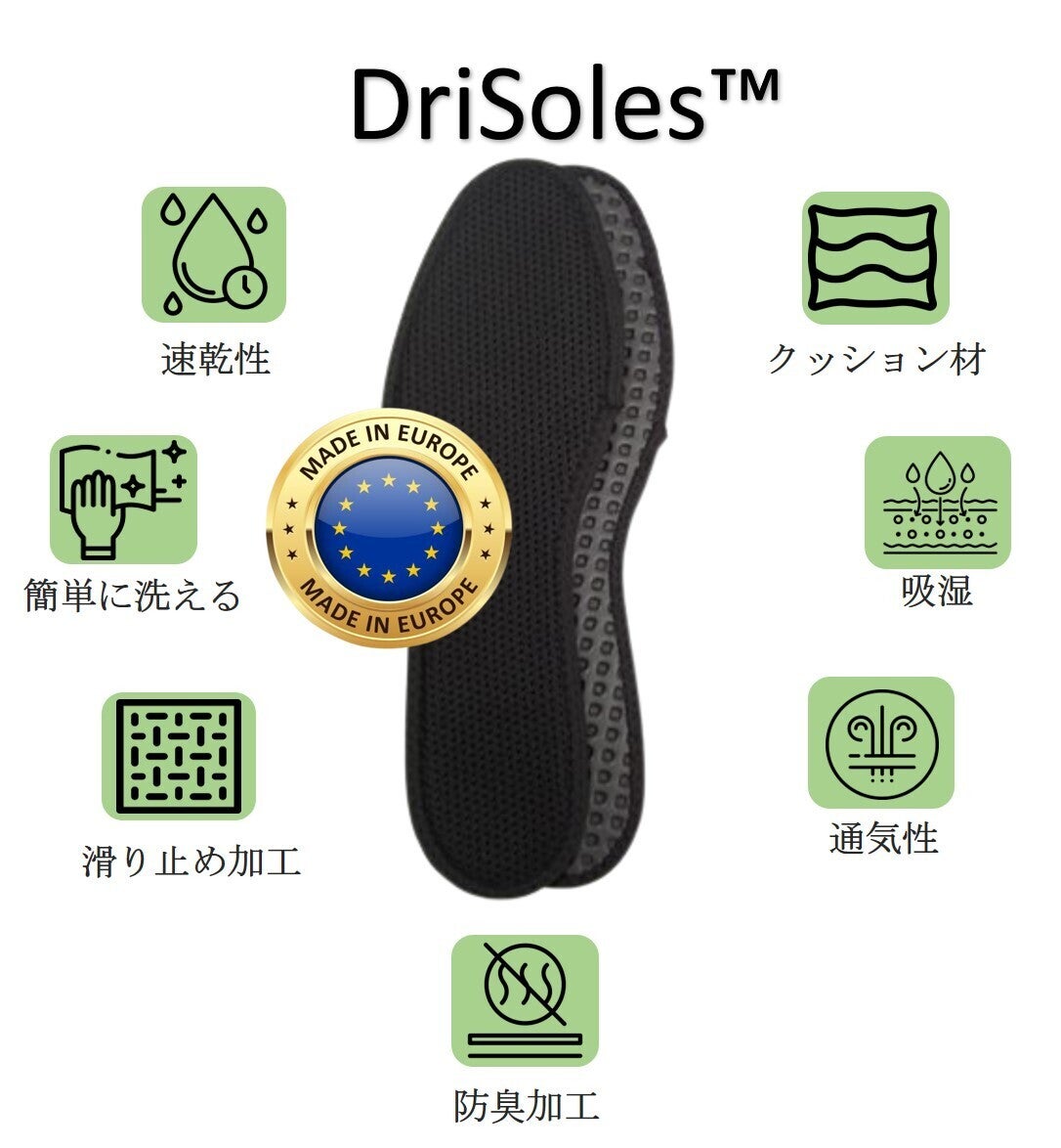 DriSoles™は100%ポリエステル繊維でできているので、柔らかいのに、汗をかいた足にはくっつかないのです。また、裏面のラテックス素材が熱い地面からソールを保護し、裏面が靴の中で滑らないようにします。