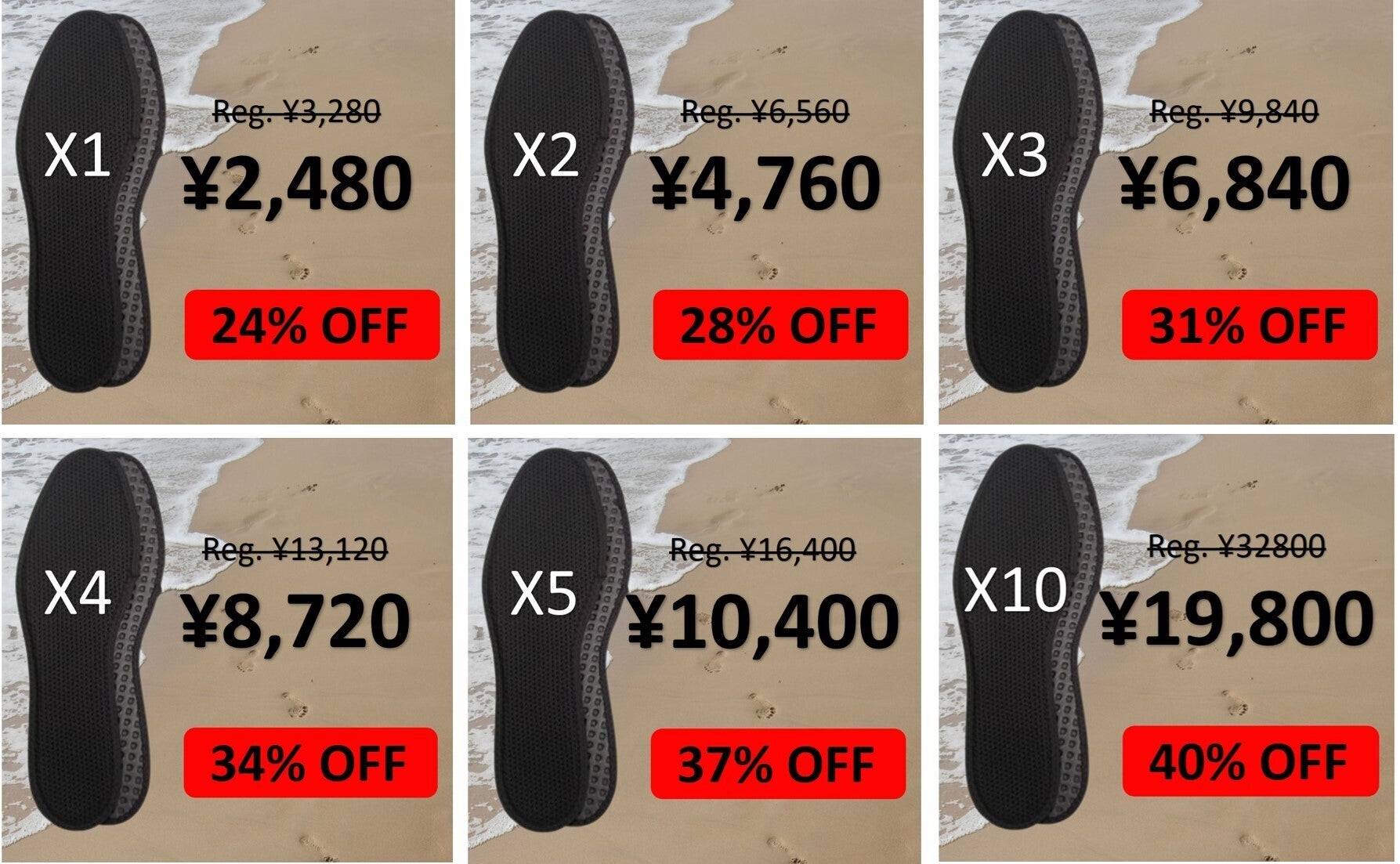 ***1つの注文で異なるサイズをご希望の場合は、注文時の「備考」欄に希望のサイズをご記入ください。何も記載がない場合は、注文したすべてのインソールに、選択されたサイズを希望していると見なされます。たとえば、3つのインソールを注文し、281mmサイズを選択した場合、281mmサイズのインソール3つが配送されます。注文時に3つのインソールを選択し、「備考」欄に281mmサイズのインソールが2つ、287mmサイズのインソールが1つ必要であることを記載すると、その内容で納入されます。