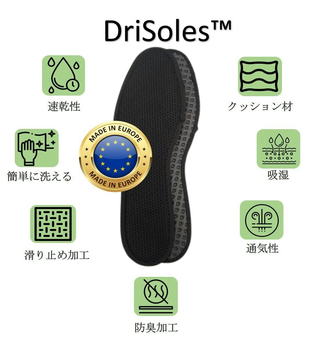 DriSoles™は、内層のポリエステル繊維が疎水性であるため、本質的に臭いを抑えることができます。また、このインナーには、足の汗を自然消臭する強力な消臭材を塗布しています。