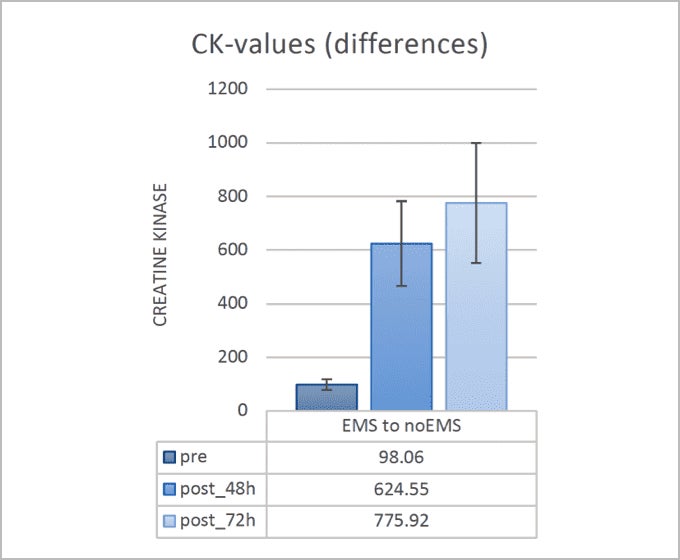 筋負荷を表すクレアチンキナーゼという体内酵素が、EMSスーツを着用して運動した場合にはトレーニング後に大きく上昇し、着用しなかった場合に比べて48時間後に約6.2倍、72時間後には約7.8倍と大きな差が生じることがわかりました。