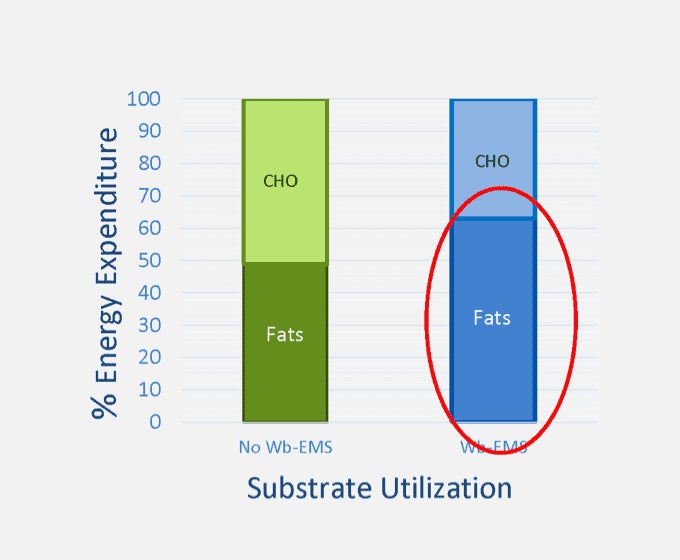 EMSスーツを着用してランニングした場合、着用しなかった場合に比べて、エネルギー消費当たりの脂肪利用率が高いことがわかりました。