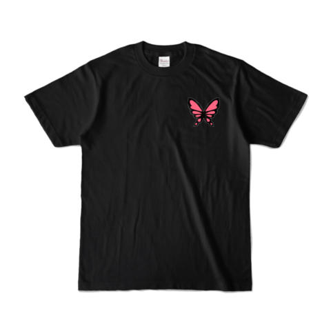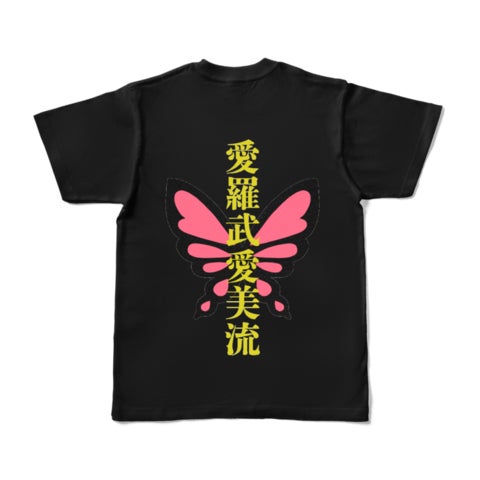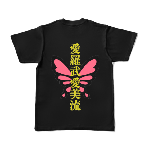 ☆50000円 会員カード+サイン色紙+缶バッジ+アクスタ+フェイスタオル+ひみつのえみる暴走族風Tシャツ 胸元にはワンポイントの蝶が後ろには愛羅武愛美流のロゴと大きい蝶々がいます。カラーは黒でS、M、L、LLサイズがあります。※画像はイメージです。