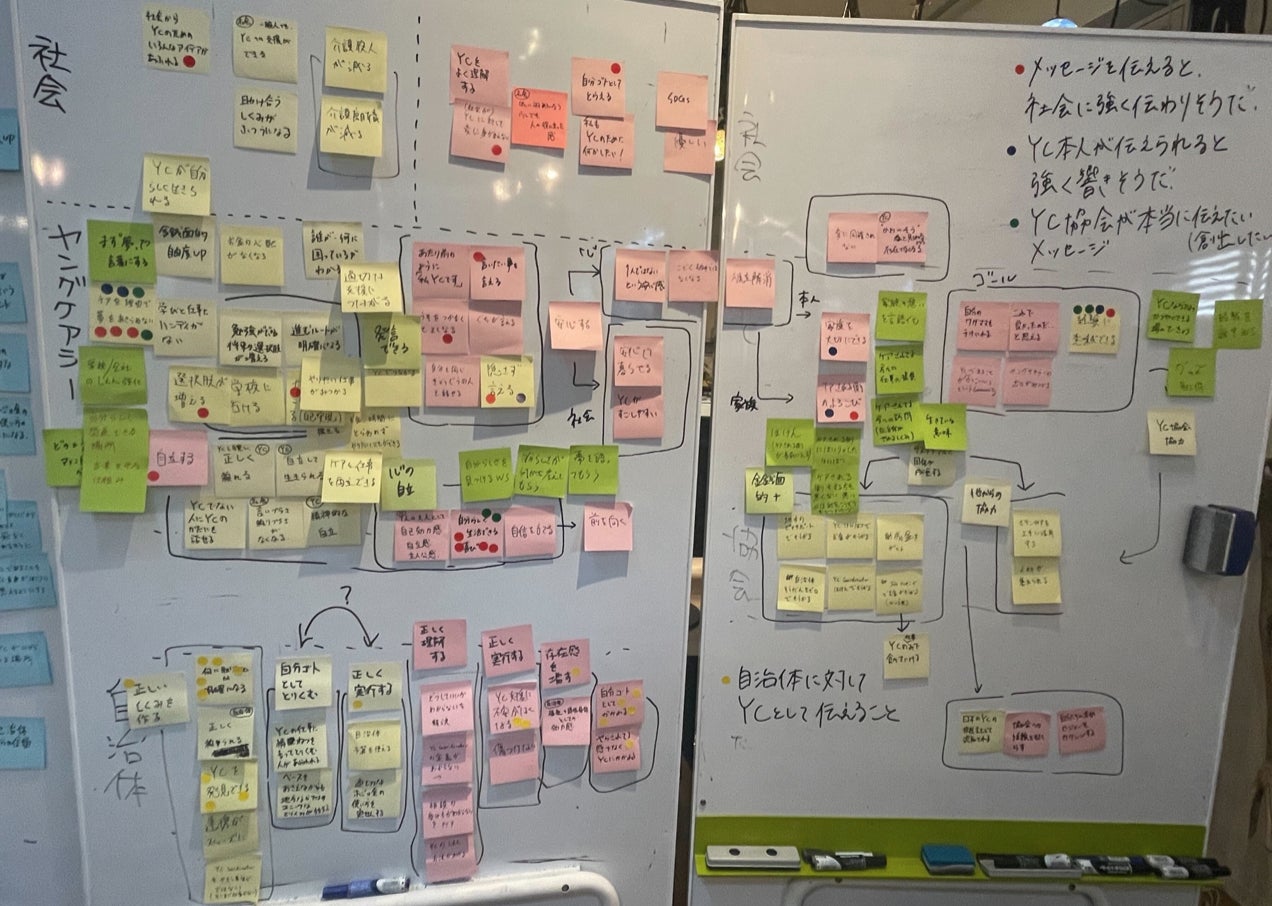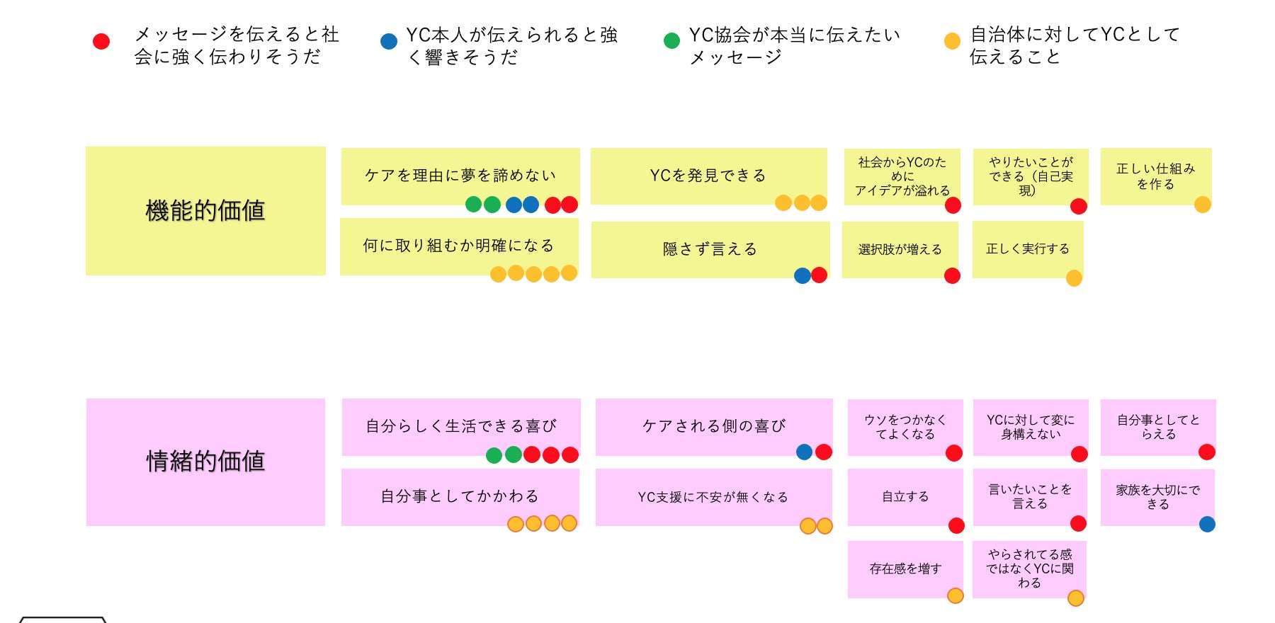 このように「見える化」することで、協会としてヤングケアラーにとって提供したい価値を言語化しシェアすることができます。こうして沢山出されたアイデアの中から、みんなが重要だ/大切だと思うことに投票をしていきました。丸いシールが多くついている付箋が、協会メンバーが「大事だ!」と感じた意見になります。