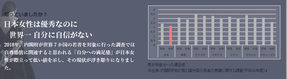 2018年、内閣府が世界7ヵ国の若者を対象に行った調査では自尊感情に関連すると思われる「自分への満足感」が日本女性が際立って低い値を示し、その現状が浮き彫りになりました。