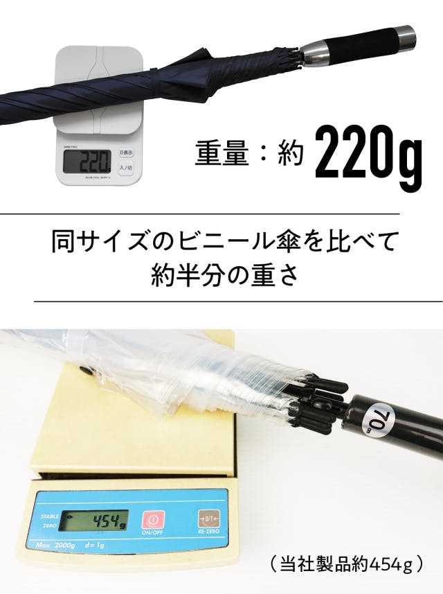重量を軽くする為に、サイズを小さくする、骨の数を減らすというのは簡単ですが、 今回開発した雨傘は親骨の長さを70cmに!