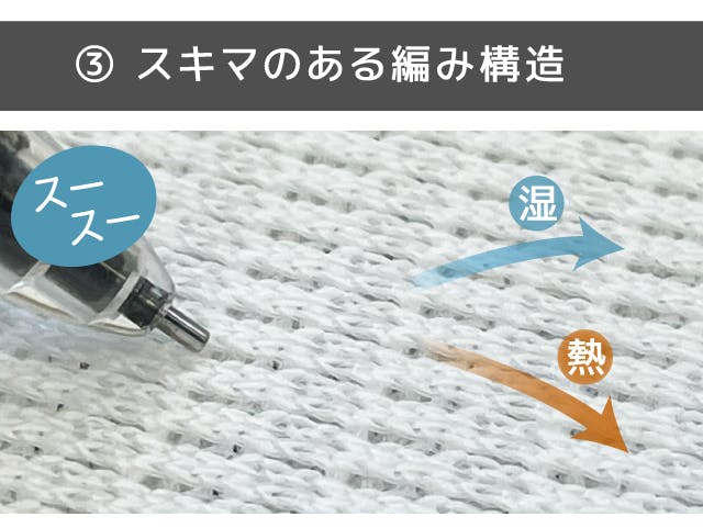 従来のデザインよりも空気が抜ける「スキマ」が多いため、肌への接触面積が減り、サラサラ感が増しています。