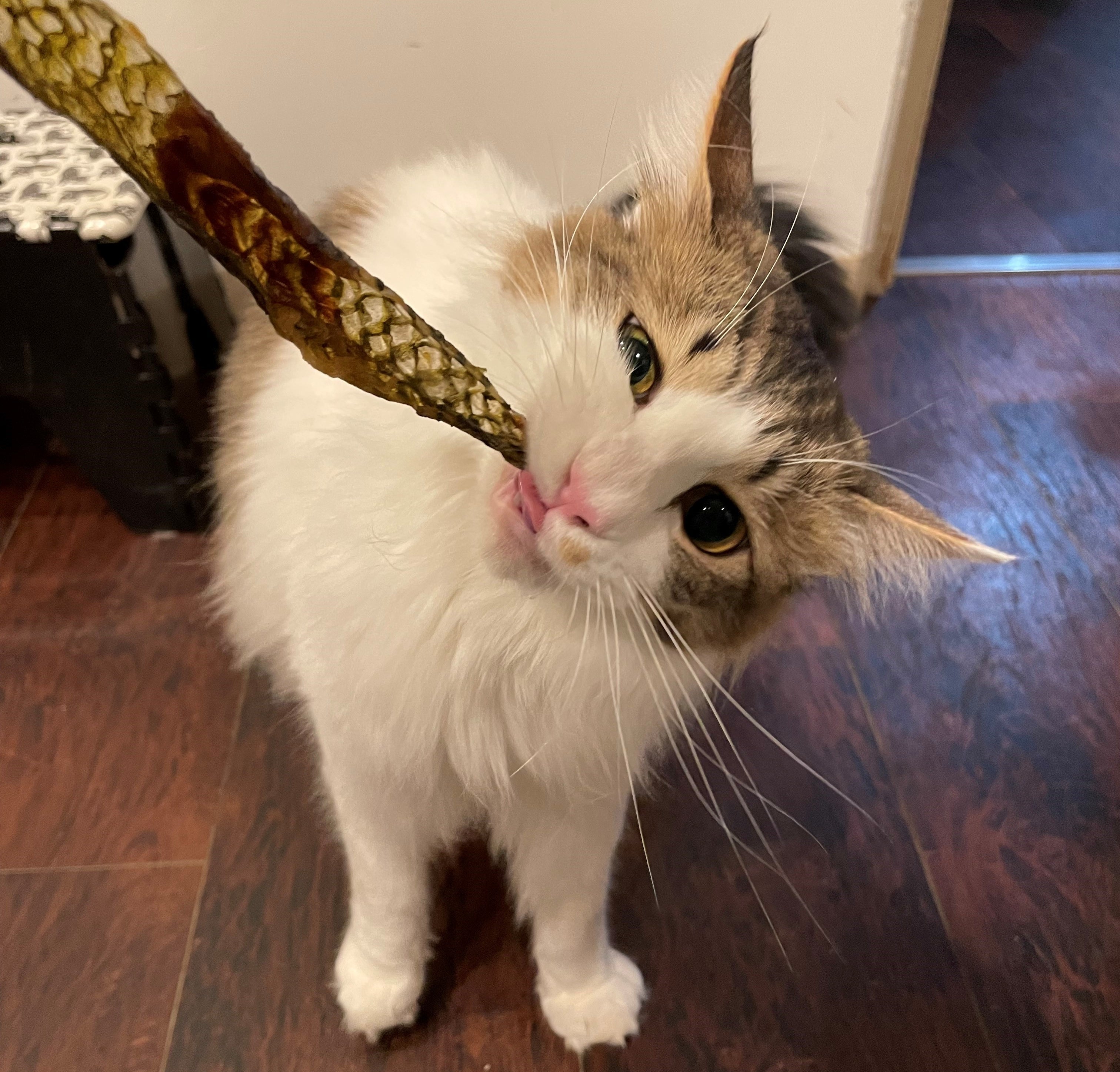 なかなか噛み切れないのがたまらないよ! 魚介ならにゃんこが好きだと思い、尼崎港で廃材をいただいてホームでフライパンで焼いたり、乾燥させたり、猫のおやつを作ってみました。