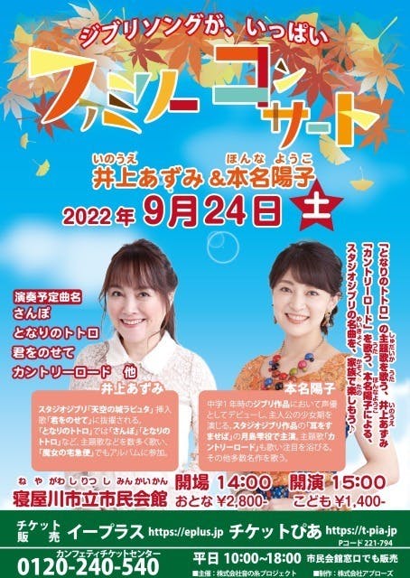9/24(土)15:00~ 【延期公演】井上あずみ様、本名陽子様ジブリファミリーコンサート 寝屋川市立市民会館