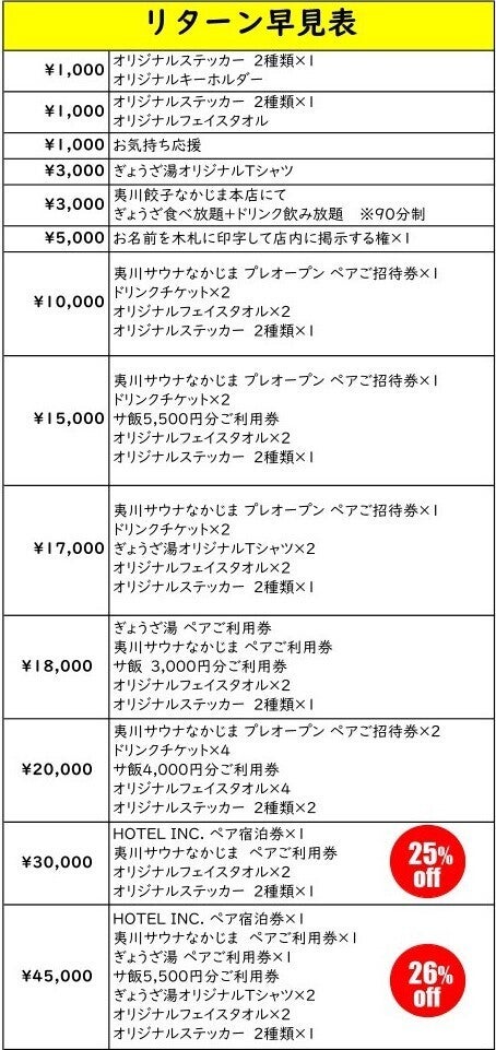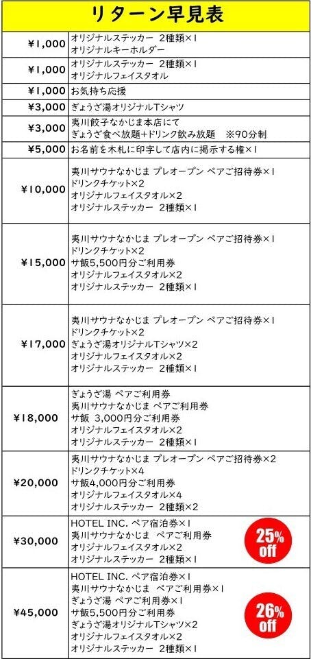 そして次は夷川餃子なかじま本店、夷川サウナなかじま、HOTEL INC. の「3セット3サイコープラン 」。
